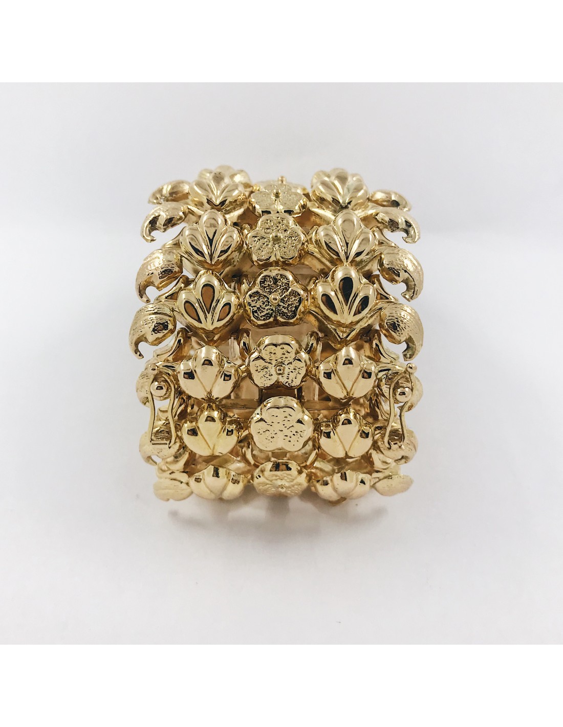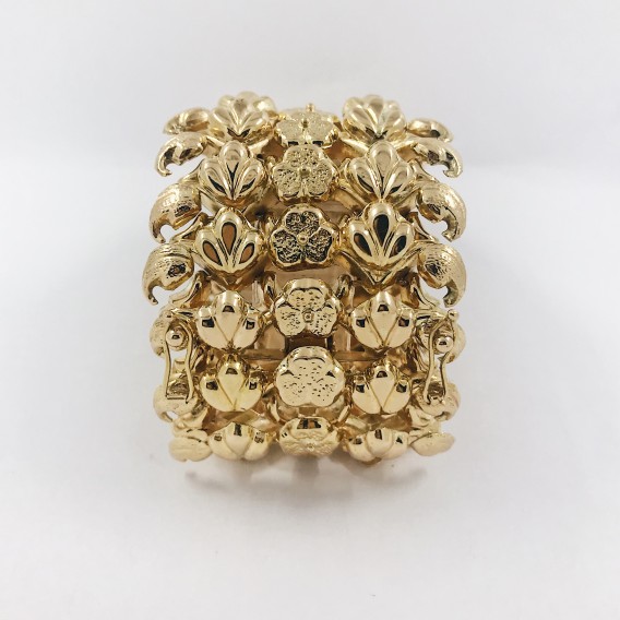 Pulsera ancha de segunda mano, oro de 18kt. Como adorno central una fila de preciosos tréboles de 3 hojas junto una fila de conchas a cada lado y en los dos laterales una fila de hojas con acabado en punta. Diámetro 6,5cm. Ancho  4,4cm. Peso 88,50gr. Una pieza espectacular y difícil de ignorar.
