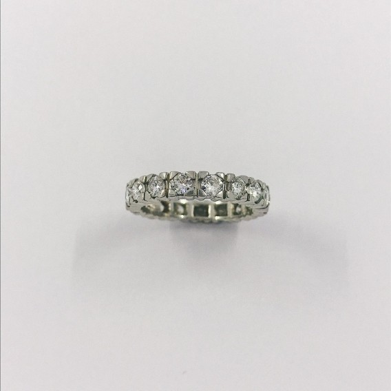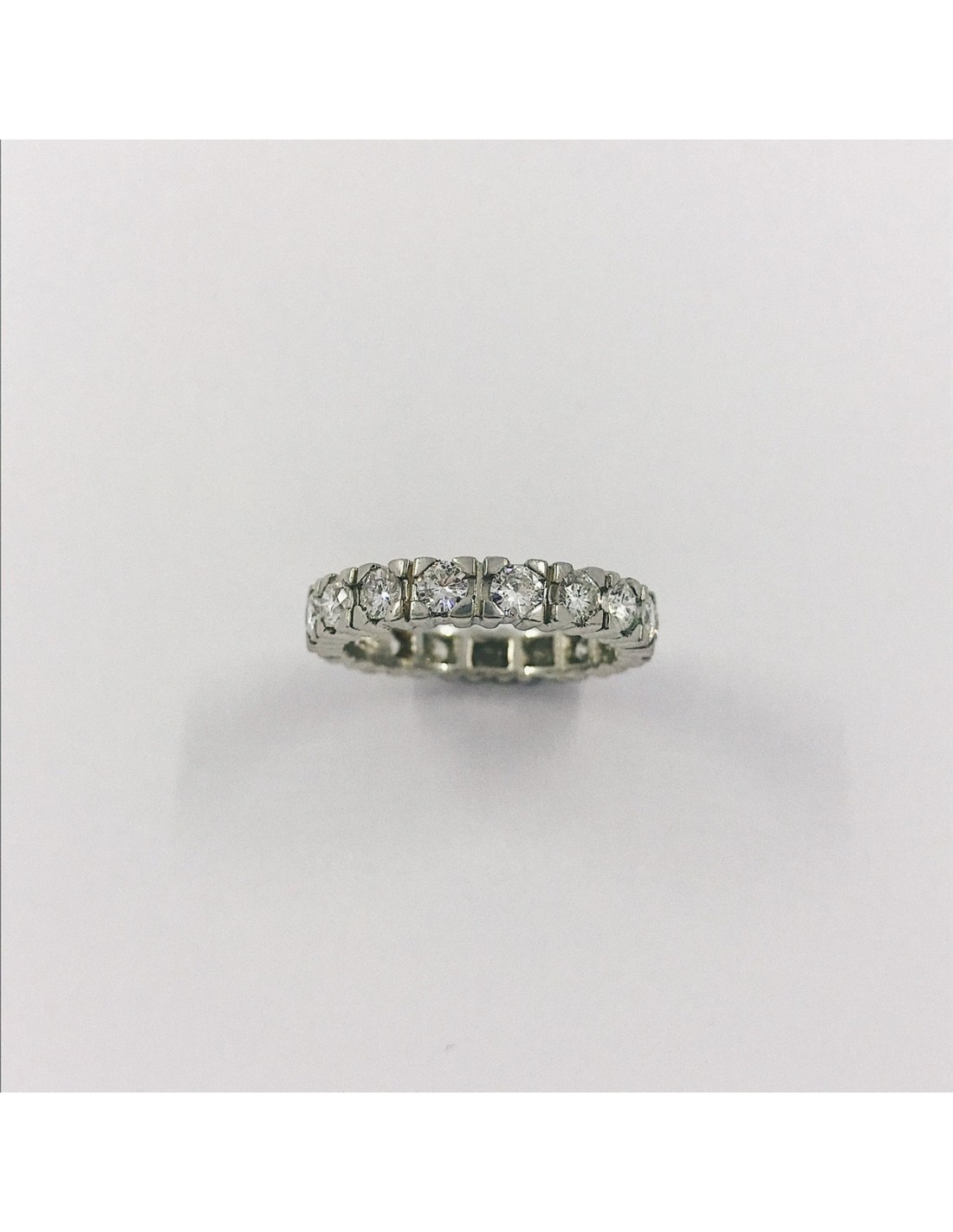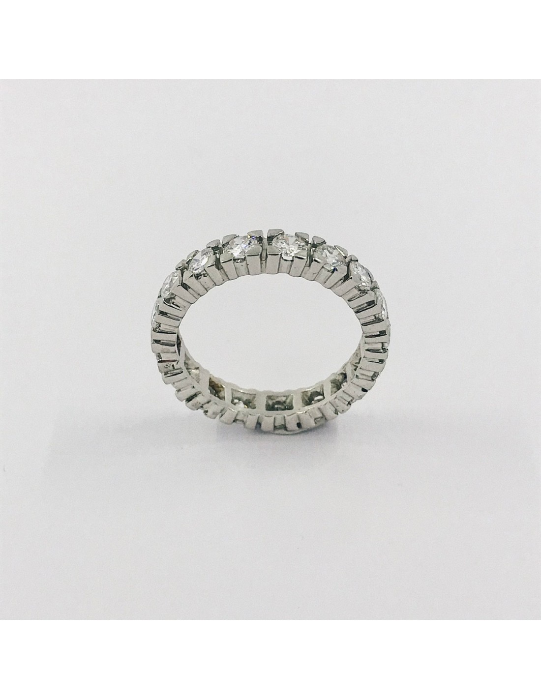Preciosa alianza de segunda mano en oro blanco de primera ley con brillantes en toda la pieza. Un magnifico anillo para llevarlo en cualquier momento. Talla: 14. Peso: 6,3gr.