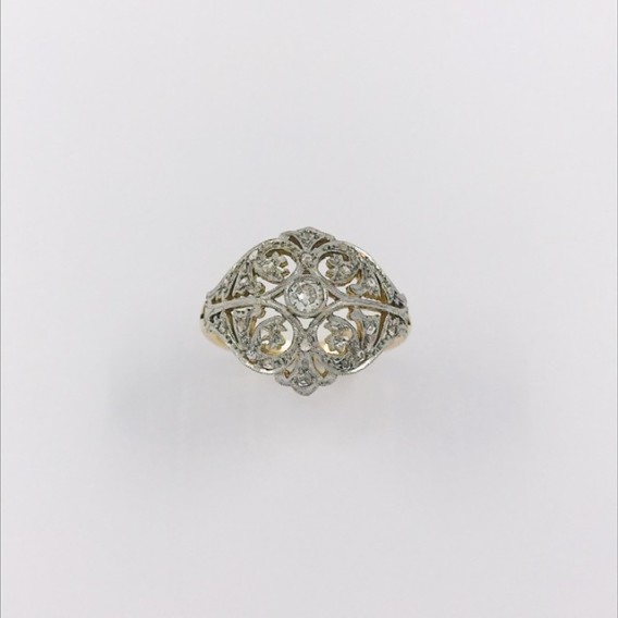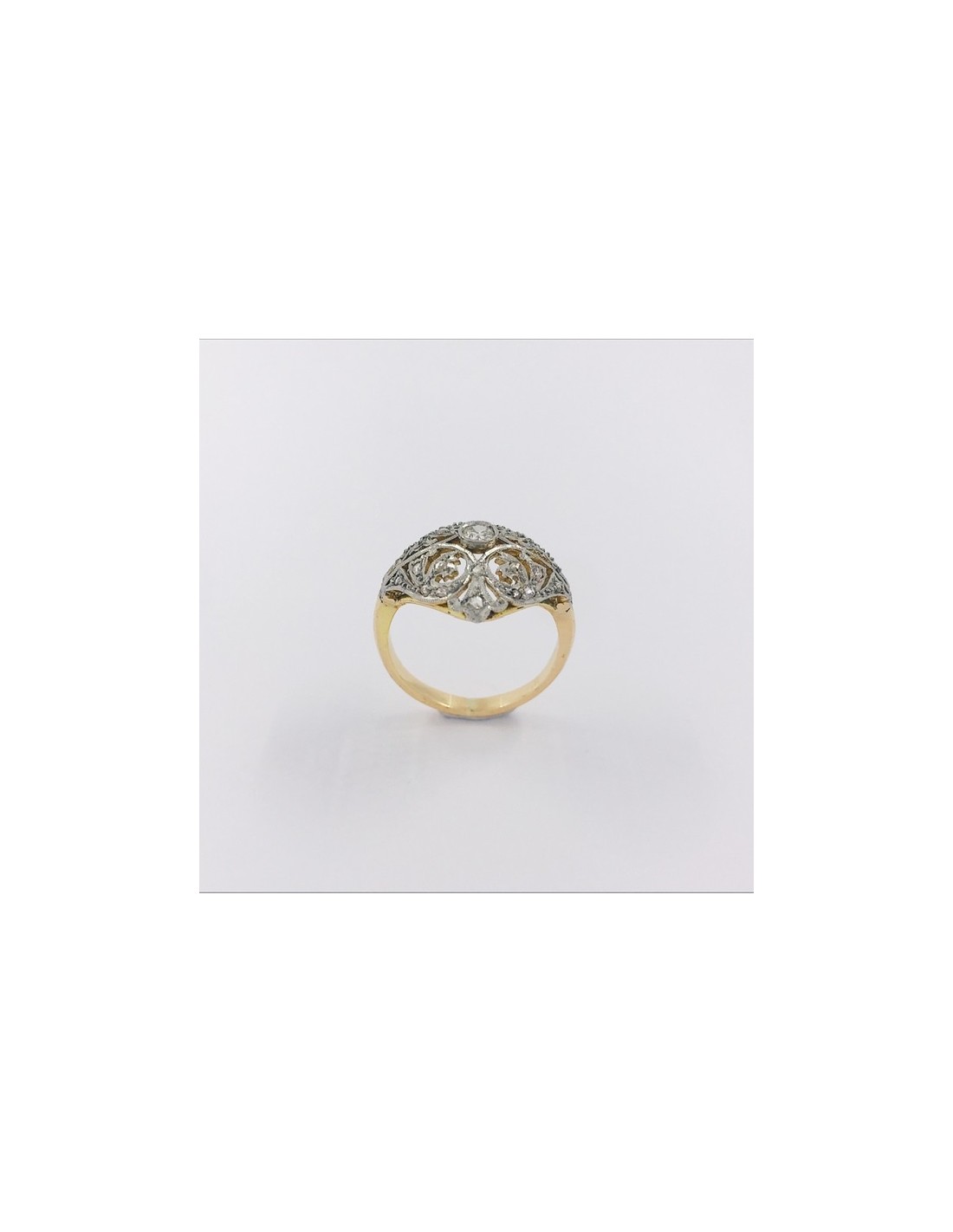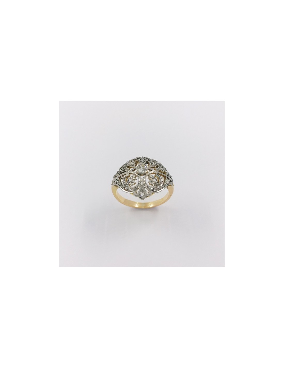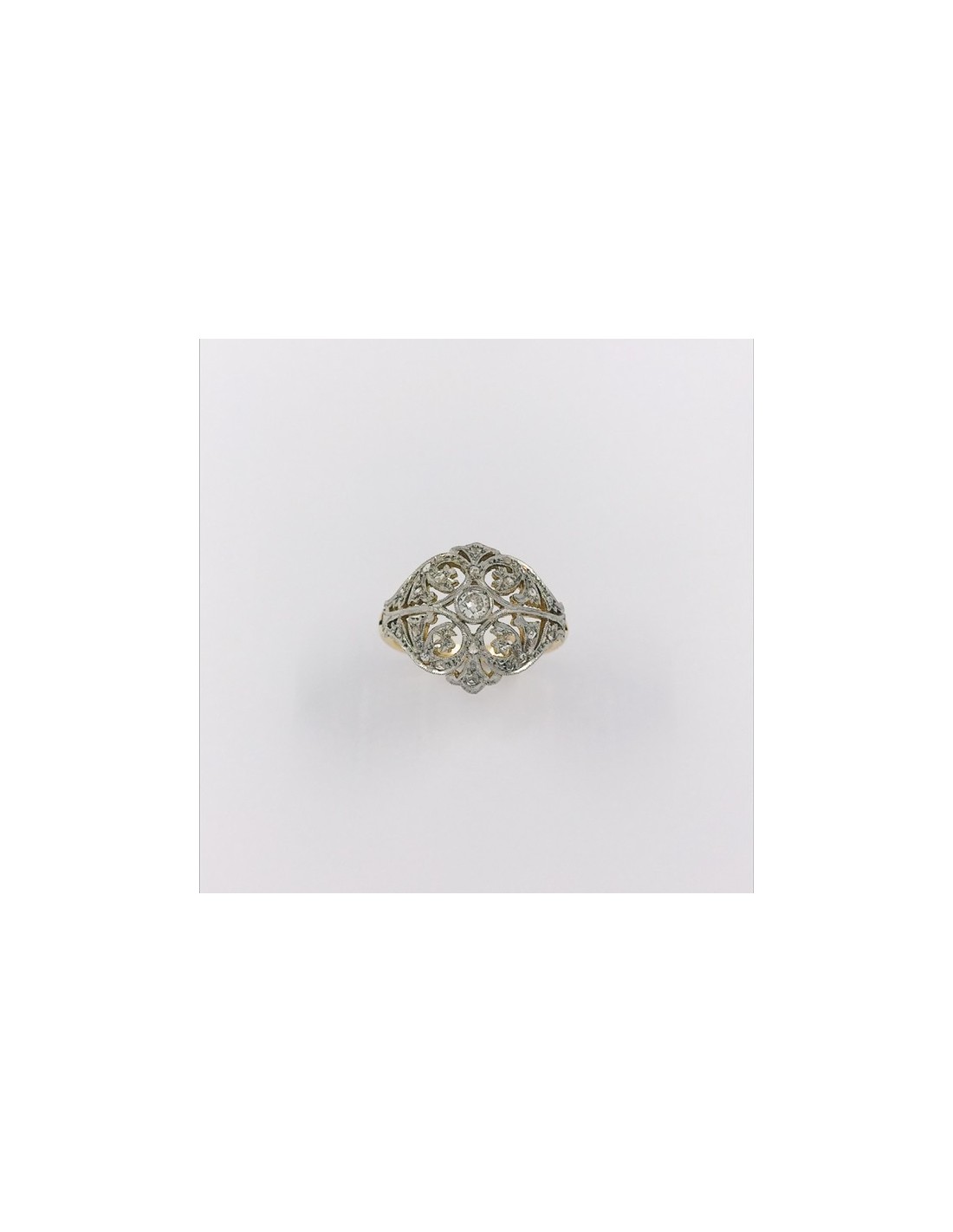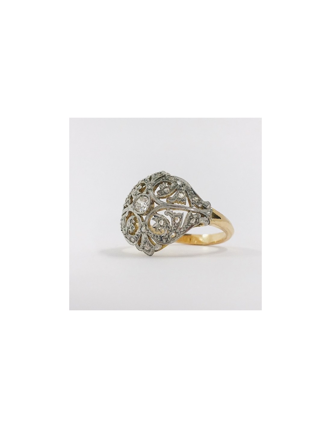 Precioso anillo de los años 20 de segunda mano en oro de primera ley y platino con diamante central y un magnífico acabado exterior. Talla: 16. Peso: 5.5gr.