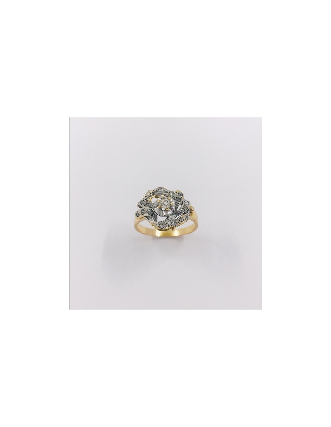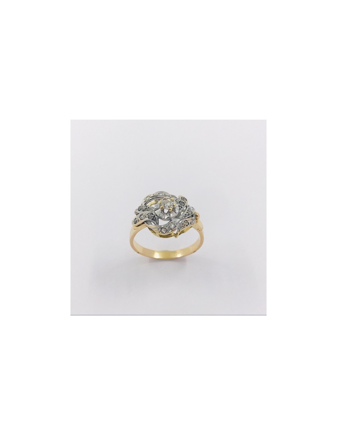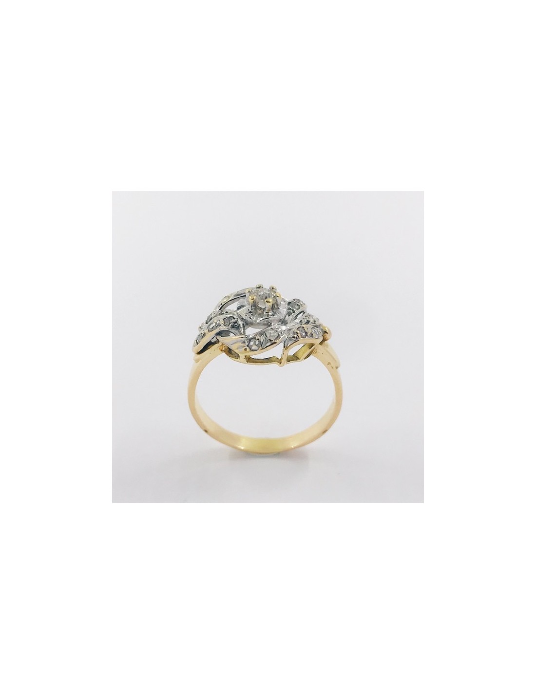 Precioso anillo de los años 40 de segunda mano en oro de primera ley y platino con diamante central y un magnífico acabado exterior. Talla: 15. Peso: 4,3gr.