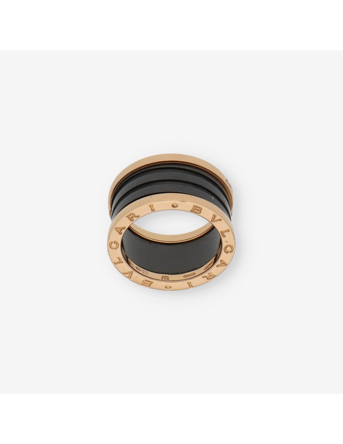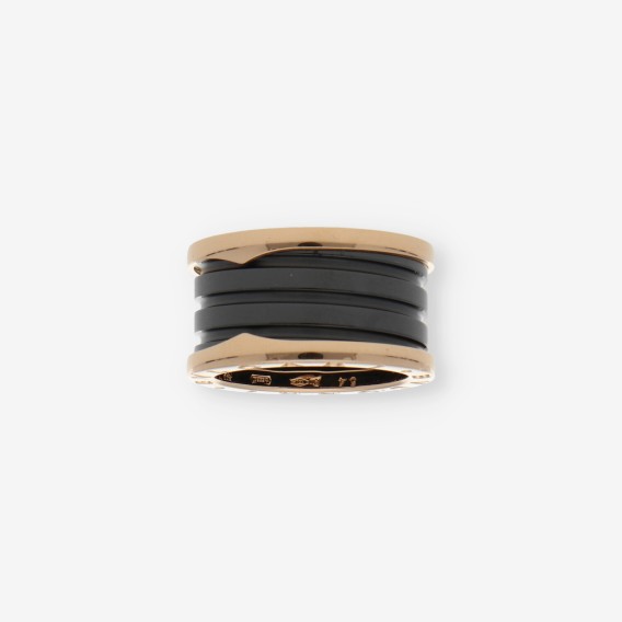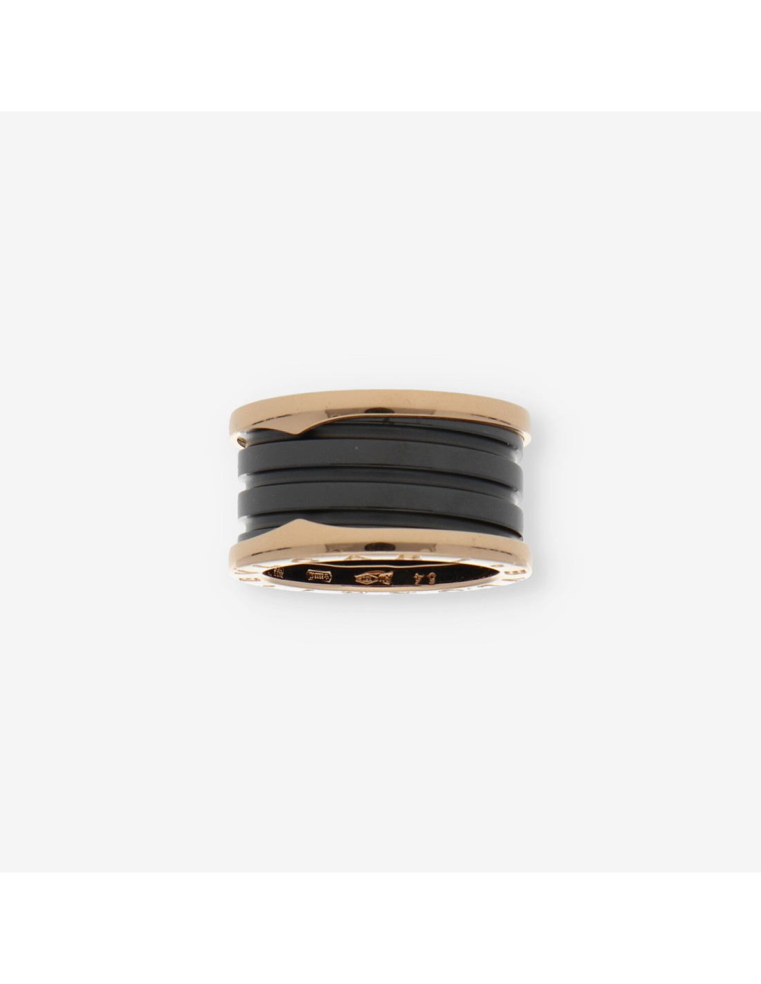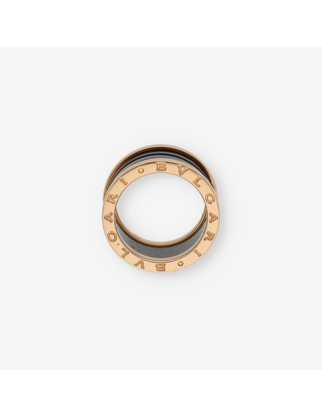 Precioso anillo Bulgari de segunda mano en oro rosa de primera ley y cerámica. Icónica pieza de cuatro bandas de la casa Bulgari e ideal para los amantes de la firma. Talla: 14 (54). Peso: 9.94gr.