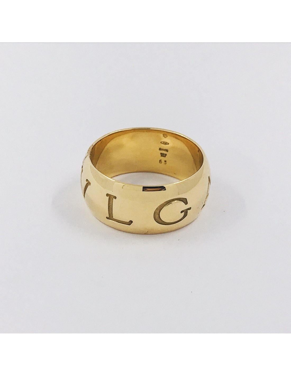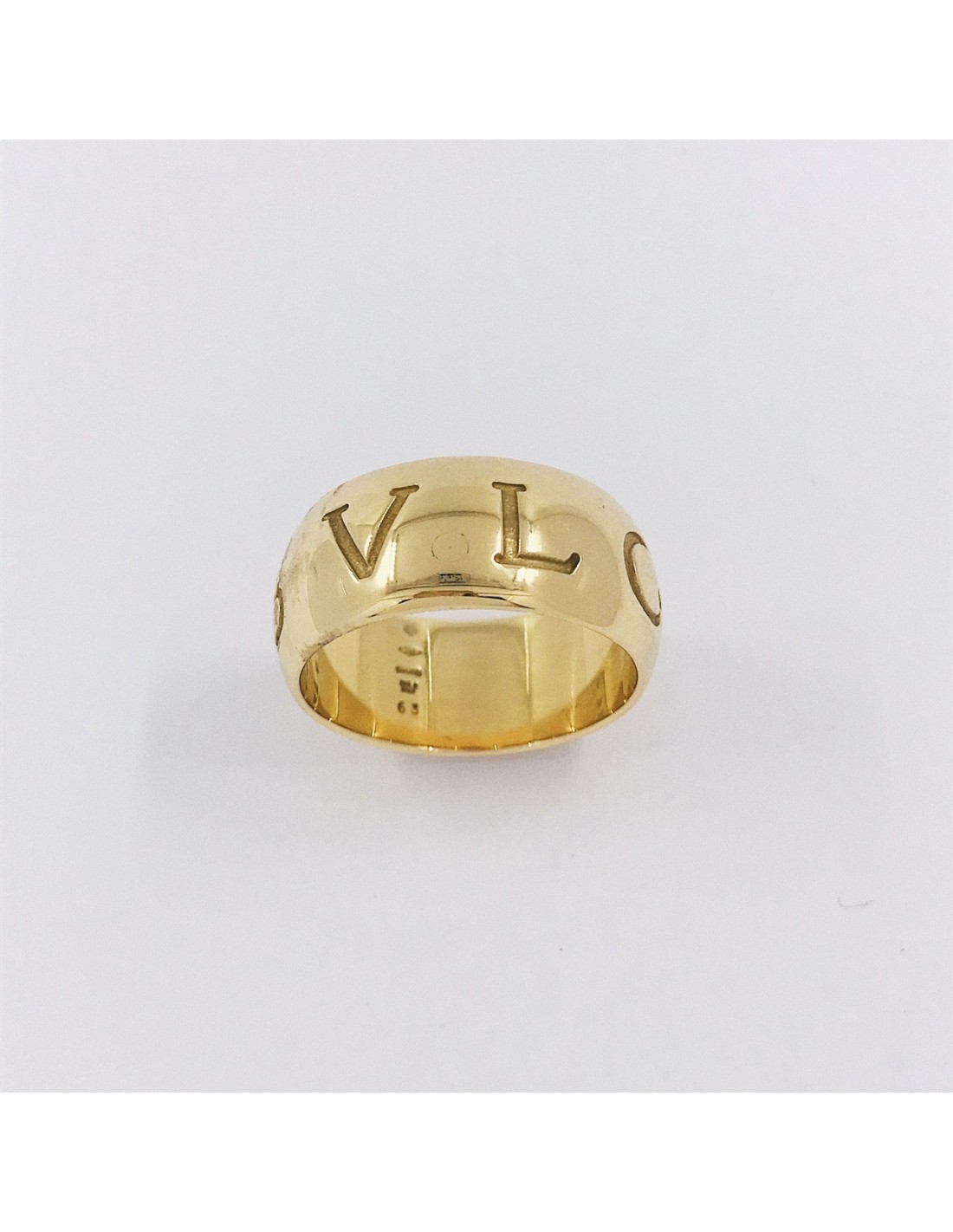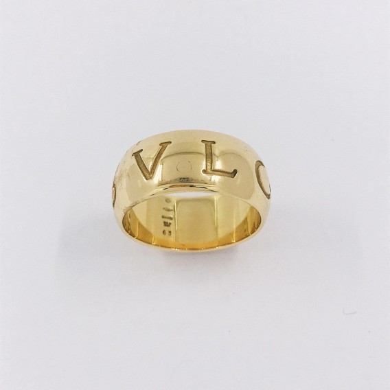 Precioso anillo Bulgari de segunda mano en oro amarillo de primera ley, de la colección Monólogo y con la firma grabado a lo largo de toda la pieza hacen de este anillo un complemento ideal para los amantes de esta prestigiosa firma. Talla: 22,5. Peso: 15,1gr.