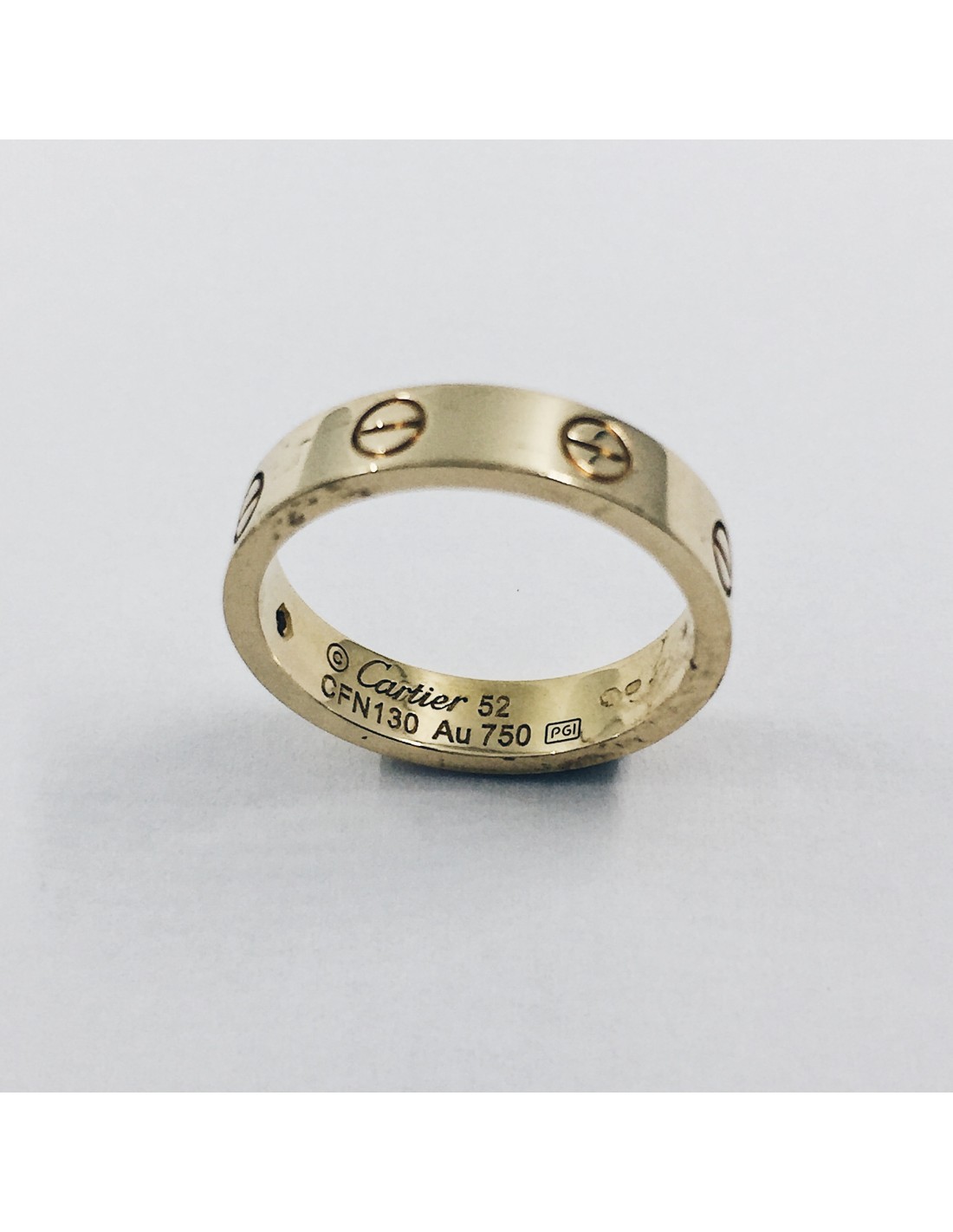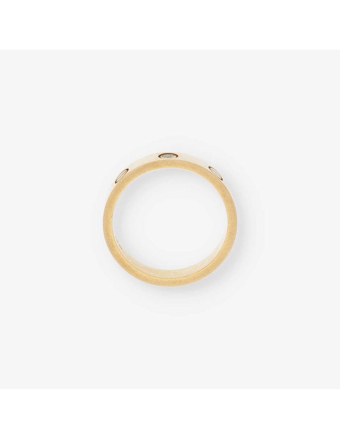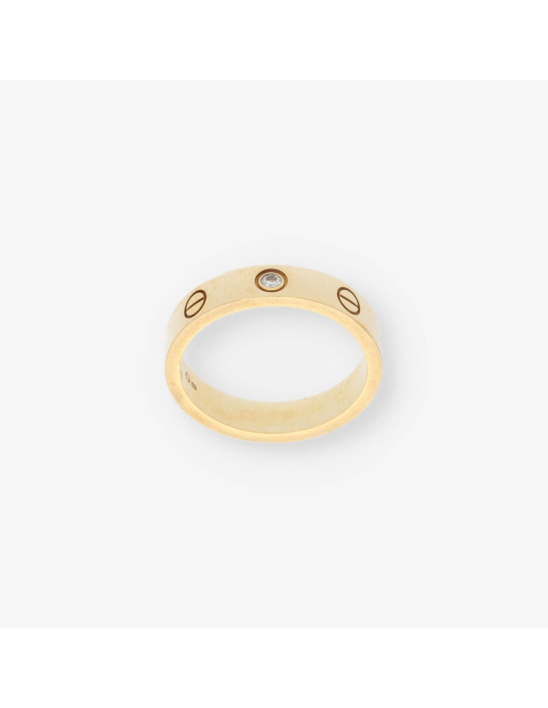 Magnífico anillo Love Cartier de segunda mano en oro amarillo de primera ley con un brillante. Una pieza ideal para los amantes de la firma. Talla: 12 (52). Peso: 4.66gr.