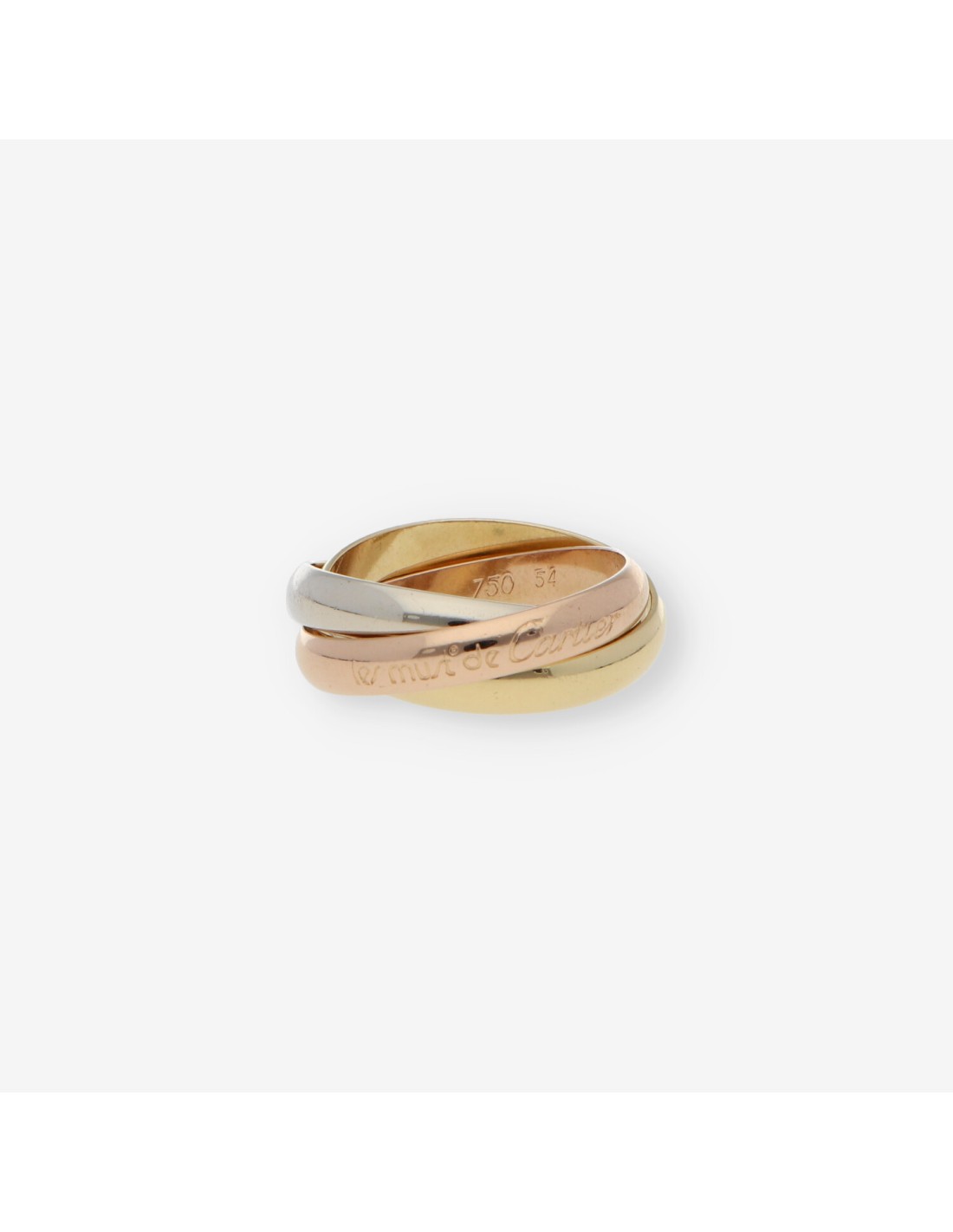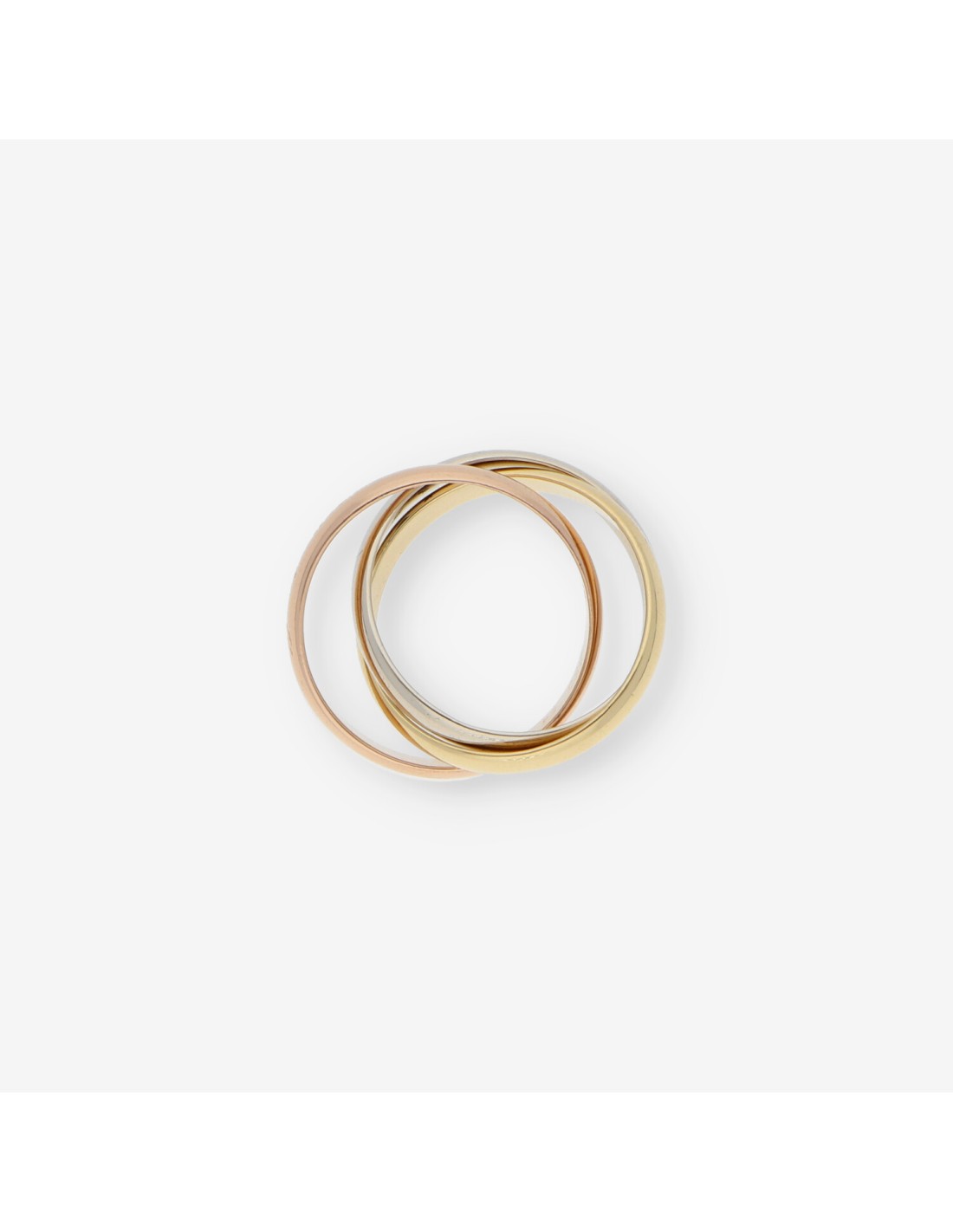 Precioso anillo Cartier Trinity de segunda mano en oro rosa, amarillo y blanco de primera ley. Una pieza indispensable para los amantes de la firma Cartier. Talla: 14(54). Peso: 8.5gr.