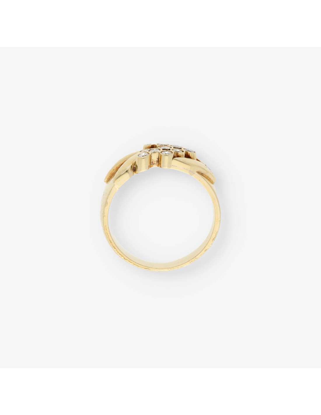 Magnifico anillo de segunda mano en oro amarillo de primera ley en perfecto estado de conservación con brillantes. Una pieza ideal para los amantes de las joya modernas. Talla:  21. Peso: 11.25gr.