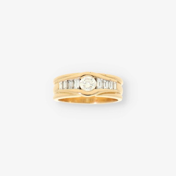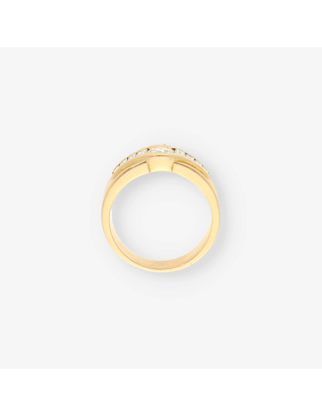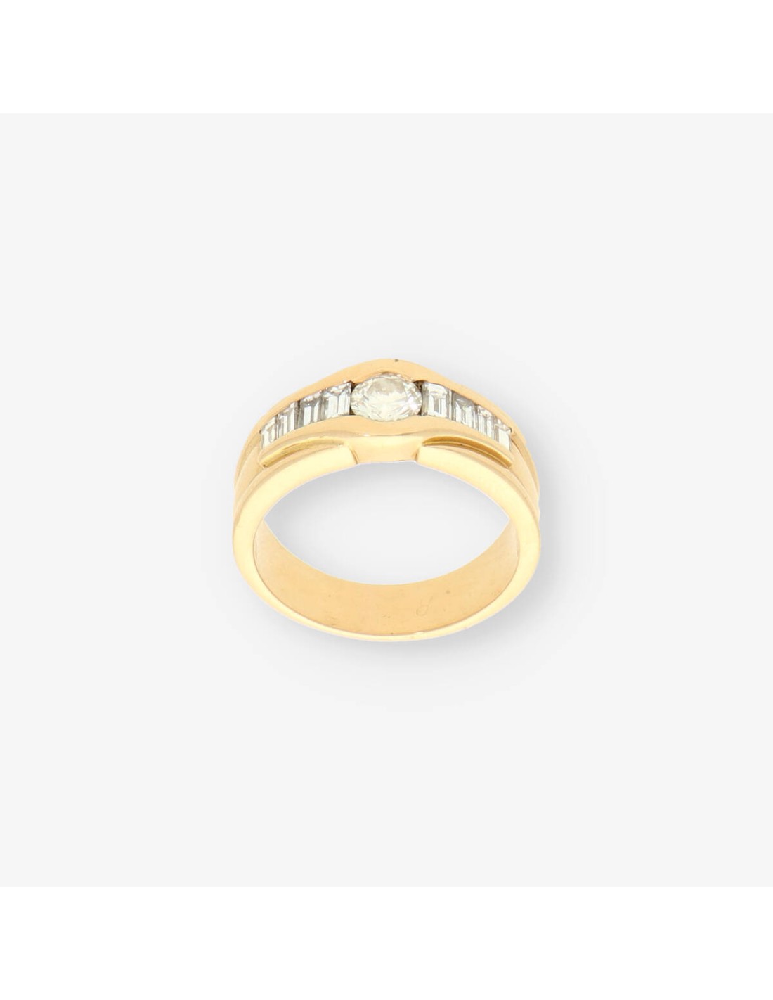 Magnifico anillo de segunda mano en oro amarillo de primera ley en perfecto estado de conservación con precioso diseño con brillante. Una pieza ideal para los amantes de las joya modernas. Talla: 17. Peso: 9.2gr.