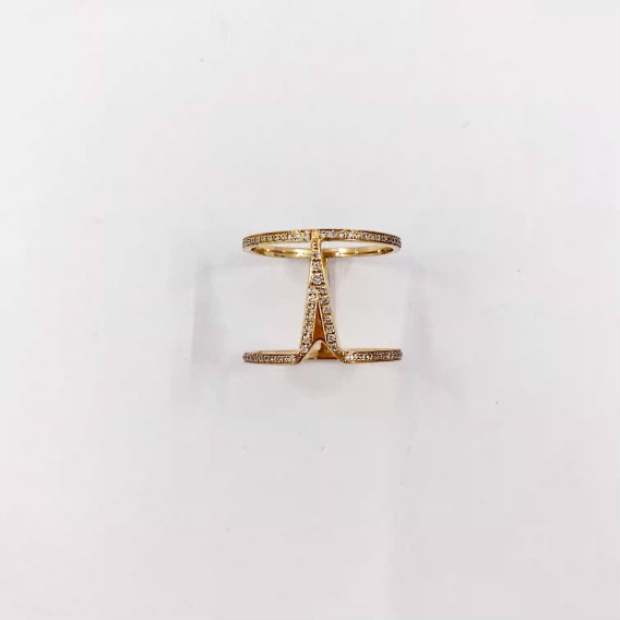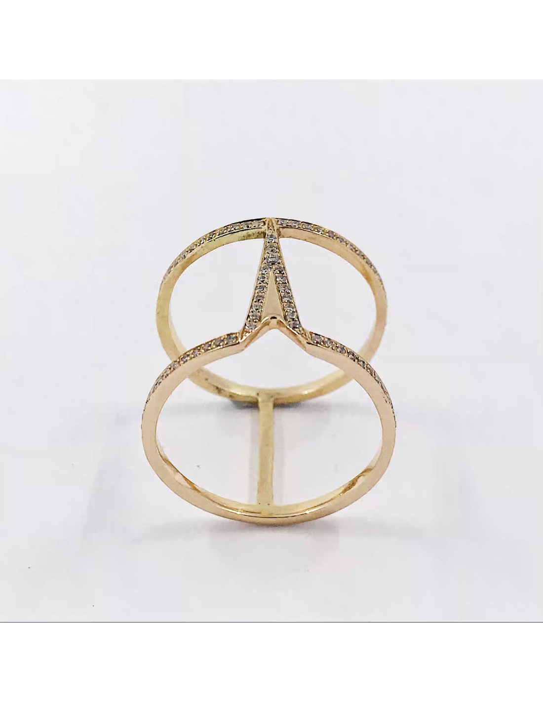 Precioso anillo de segunda mano en oro amarillo con brillantes. Un magnifico anillo de diseño con doble aro y una flecha central adornado de brillantes. Una pieza espectacular y perfecto regalo de cumpleaños. Talla:13. Peso:3,14