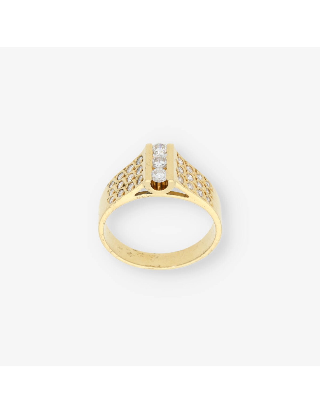Magnifico anillo de segunda mano en oro amarillo de primera ley en perfecto estado de conservación con precioso diseño con brillantes. Una pieza ideal para los amantes de las joya modernas. Talla:  17. Peso: 5.9gr.