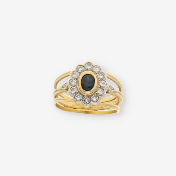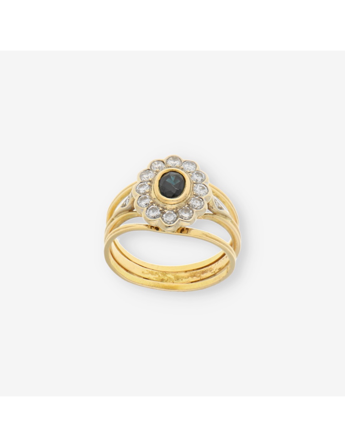 Magnifico anillo de segunda mano en oro amarillo de primera ley con un magnífico zafíro en la parte central y brillantes alrededor. Una pieza para impresionar. Talla: 15. Peso: 5.7gr.