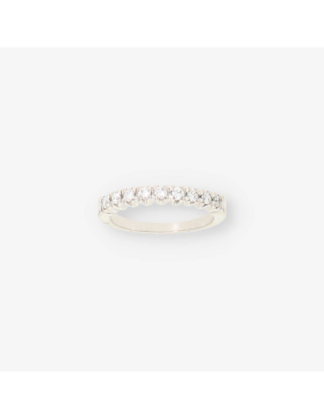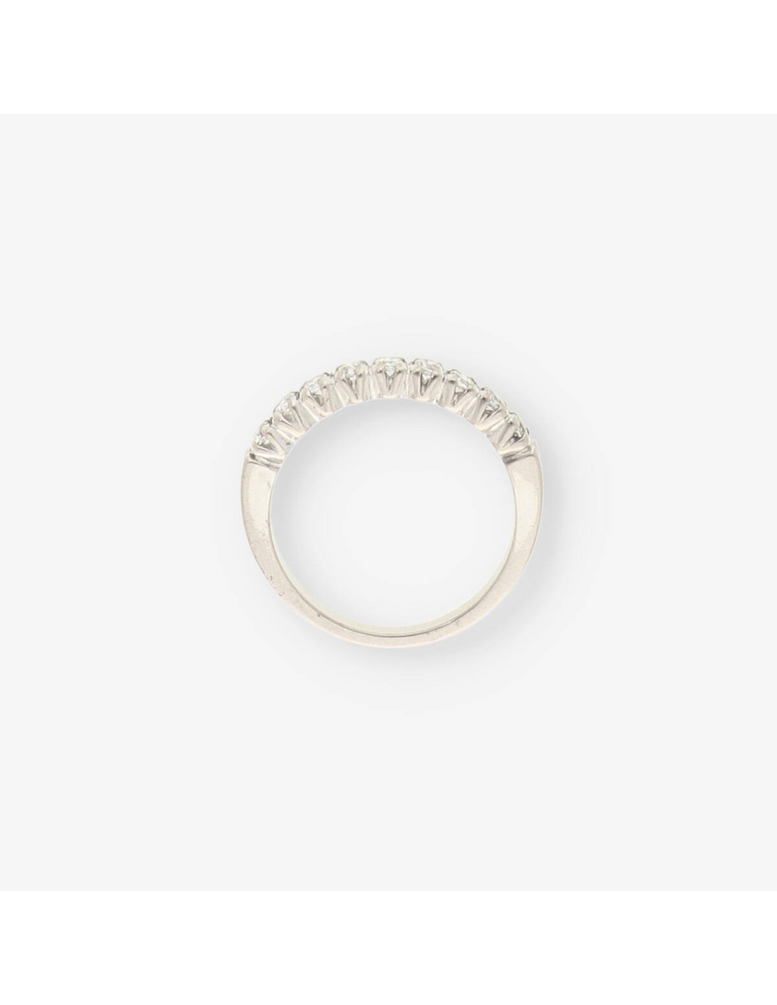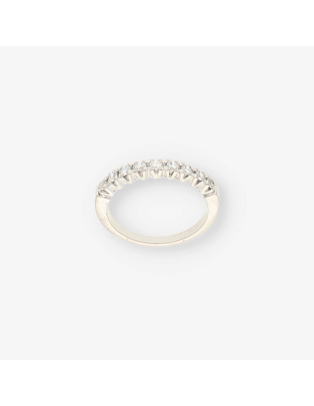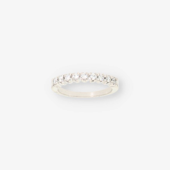 Magnifico anillo de segunda mano en oro blanco de primera ley en perfecto estado de conservación con un precioso diseño con circonitas. Una pieza ideal para los amantes de las joyas. Talla:  12. Peso: 3.2gr.