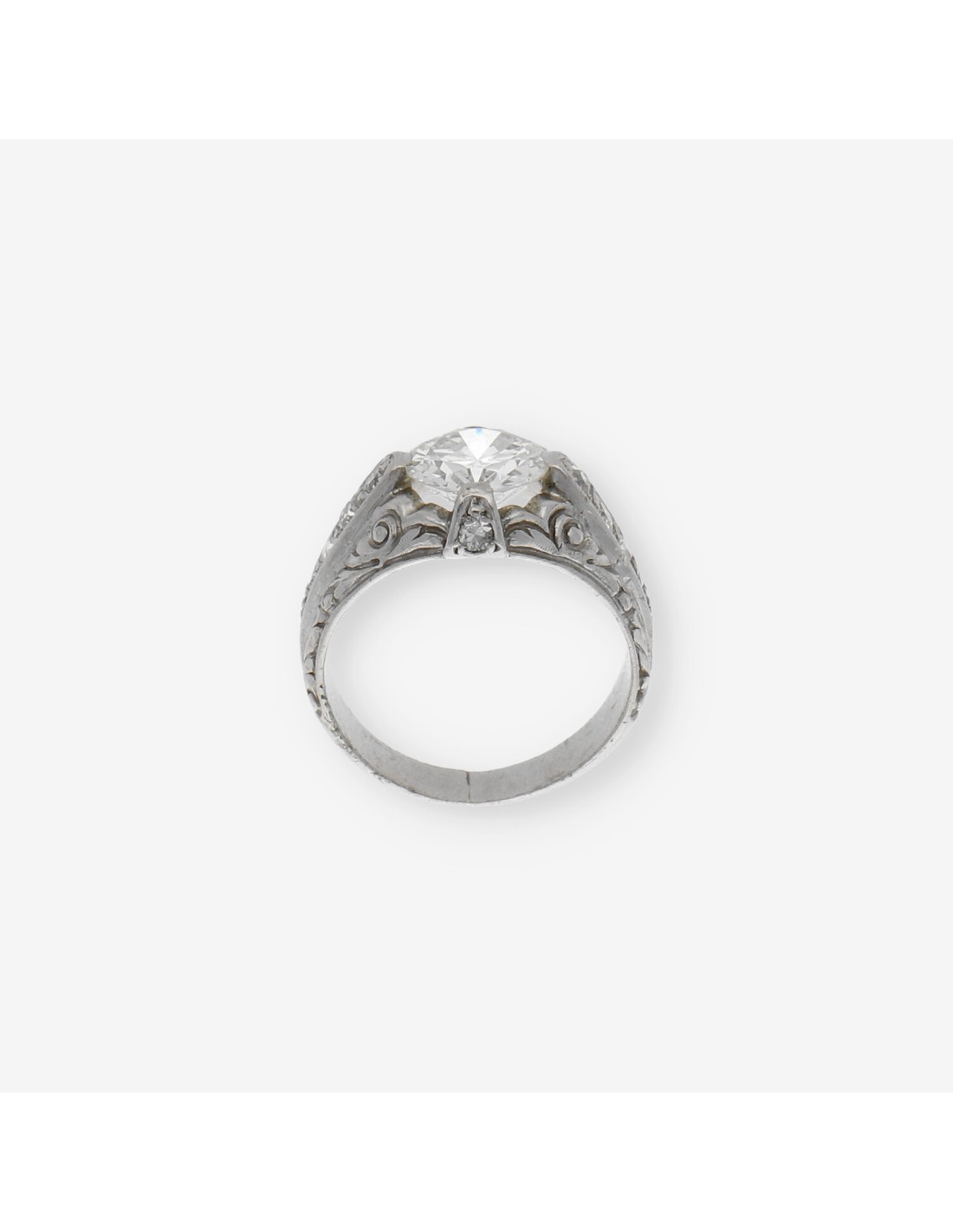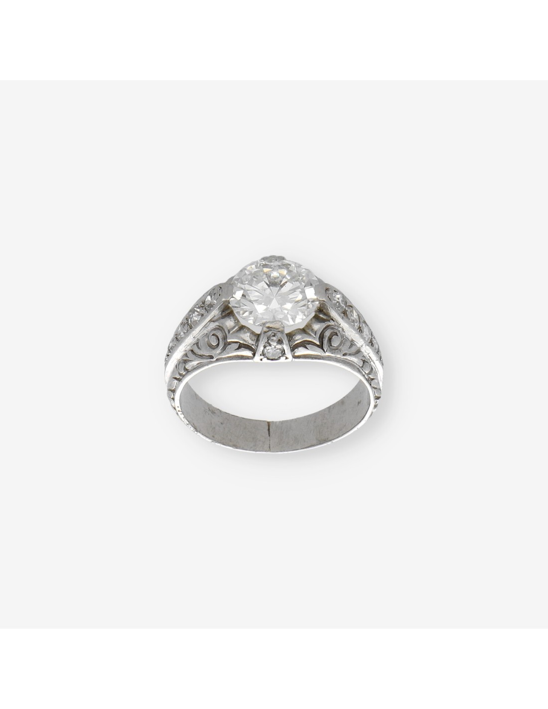 Magnifico anillo vintage de segunda mano en oro blanco de primera ley en perfecto estado de conservación con un precioso diseño  con brillante central de 2.5qt (aprox) y brillantes laterales. Una pieza ideal para los amantes de las joya antiguas. Talla:  15. Peso: 9.64gr.