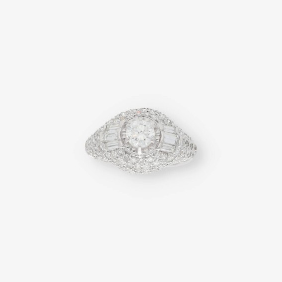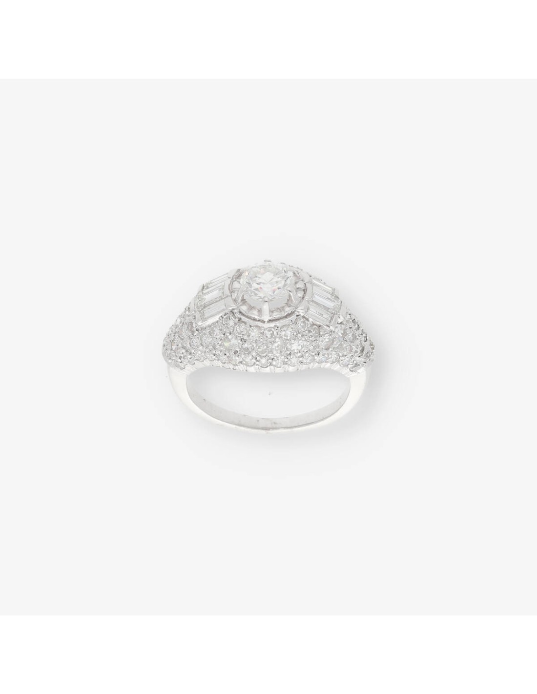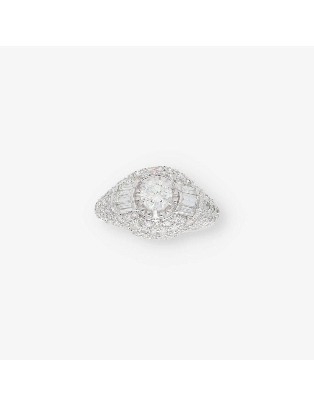 Precioso anillo  de segunda mano en oro blanco de primera ley con diamantes en talla brillante y bagget. Una pieza ideal cualquier momento. Talla: 11. Peso: 6.9gr.