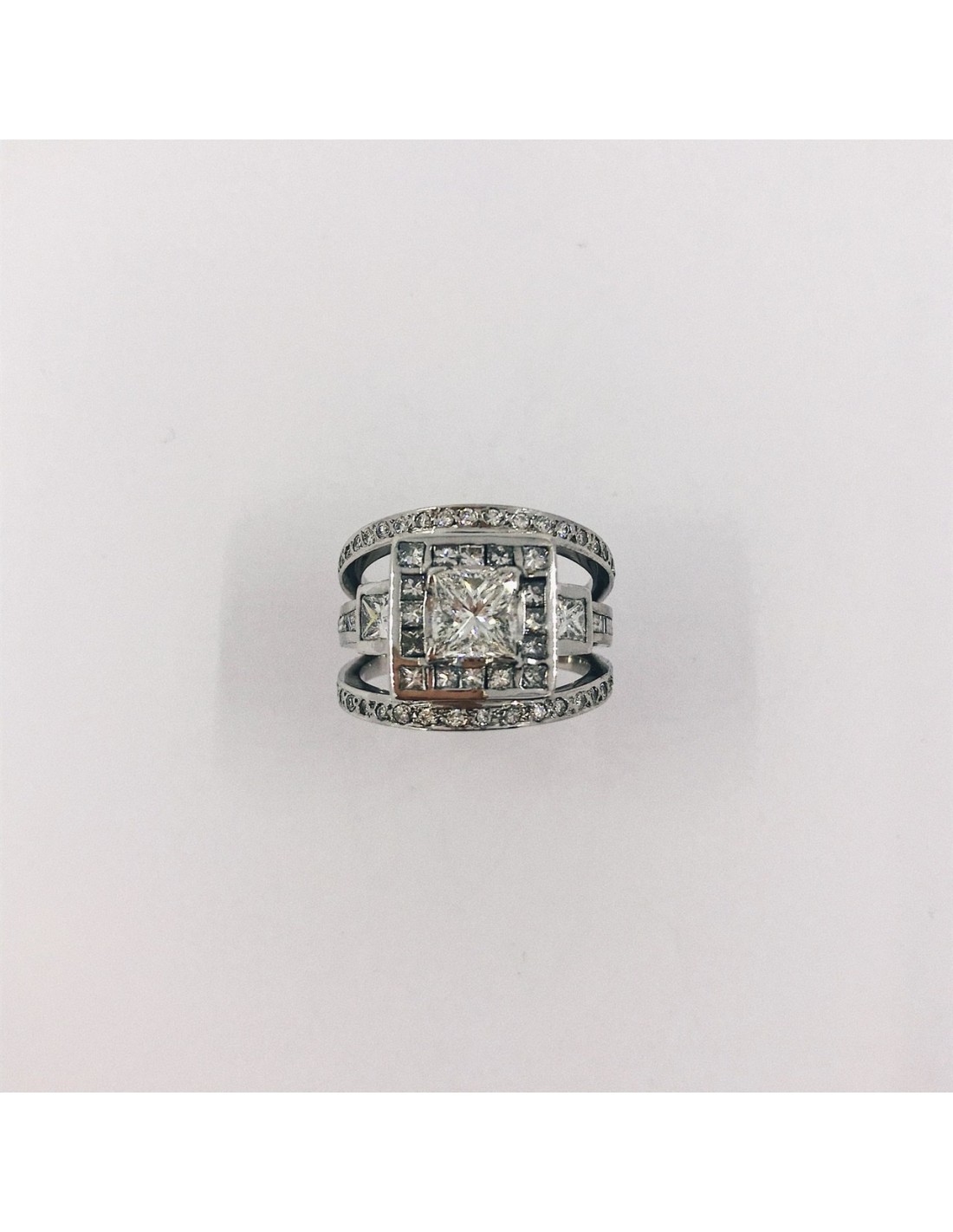 Magnifico anillo de segunda mano en oro blanco de primera ley con diamantes en tres tallas distintas. Una pieza espectacular ideal para los amantes de la joyería. Talla: 14. Peso: 11,6gr.