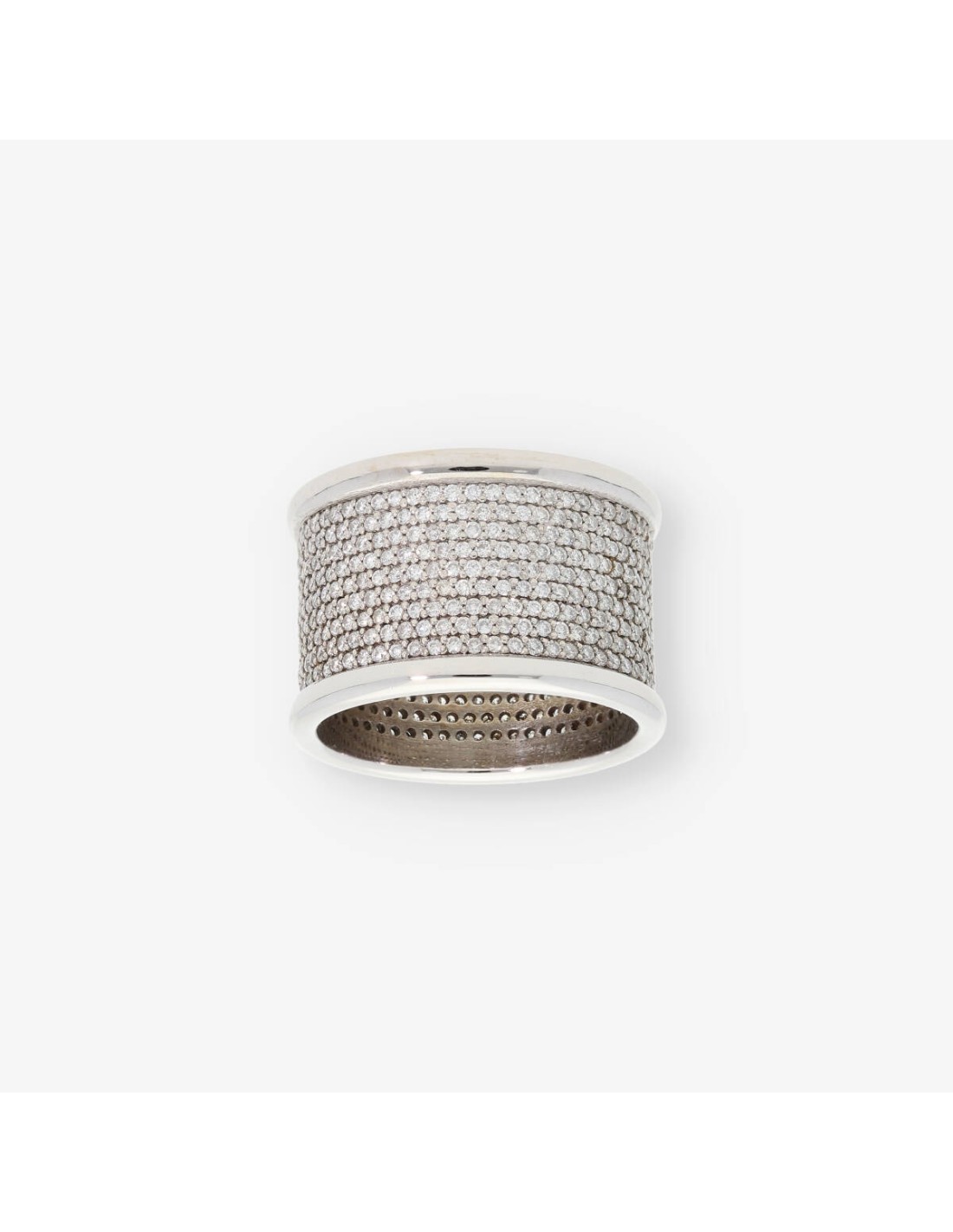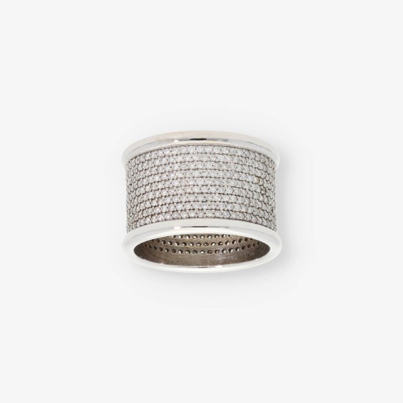 Magnifico anillo de segunda mano en oro blanco de primera ley en perfecto estado de conservación con precioso diseño con brillantes. Una pieza ideal para los amantes de las joya modernas. Talla:  21. Peso: 15.3gr.
