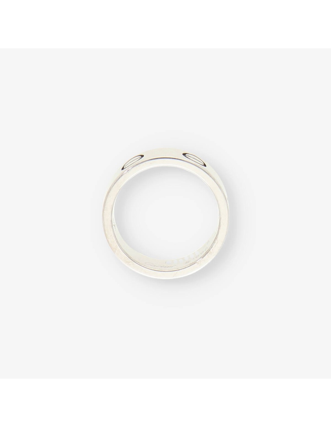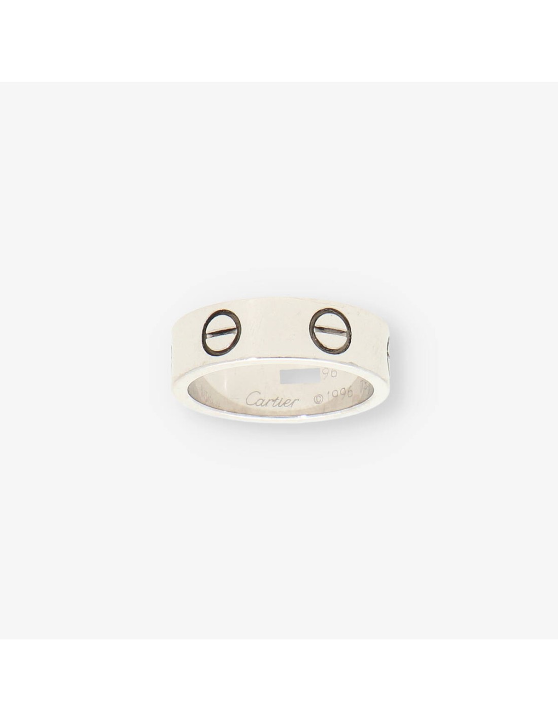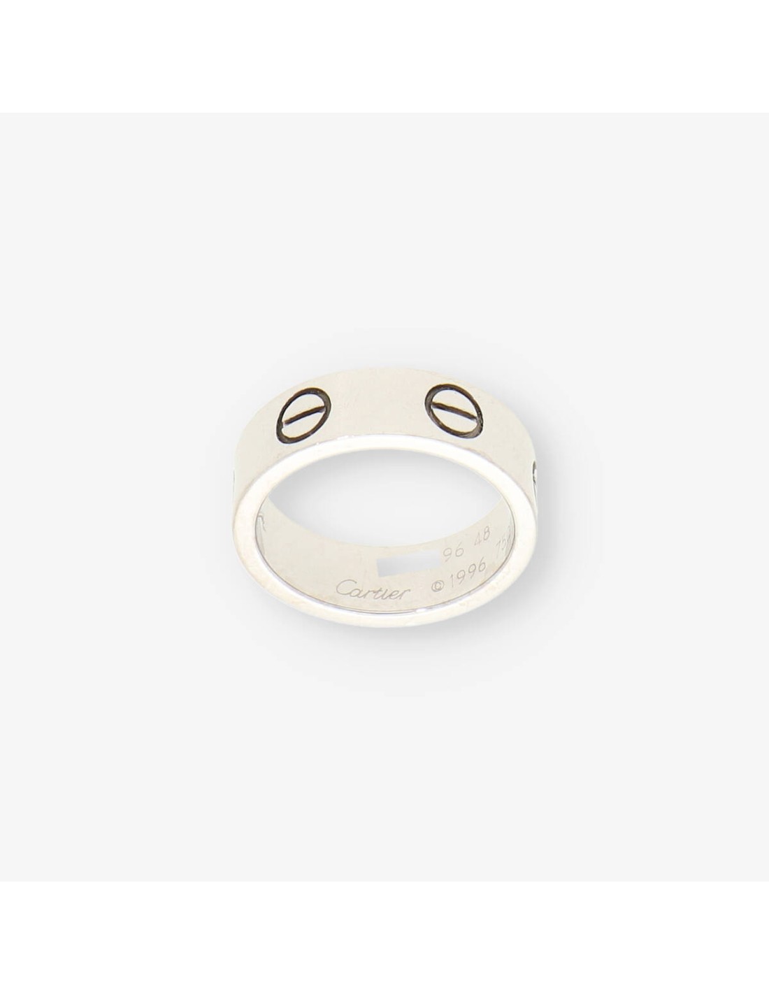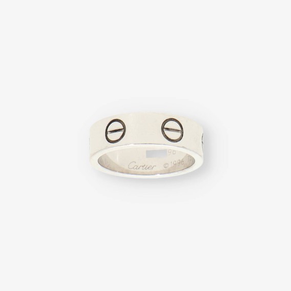Magnífico anillo Love Cartier de segunda mano en oro blanco de primera ley. Una pieza ideal para los amantes de la firma. Talla: 8 (48). Peso: 6.58gr.