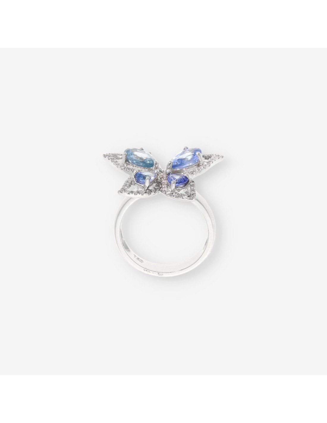 Precioso anillo en oro blanco de 18kt con forma de mariposa, cubierta de brillantes y dos zafiros en cada ala. Peso: 6,8gr