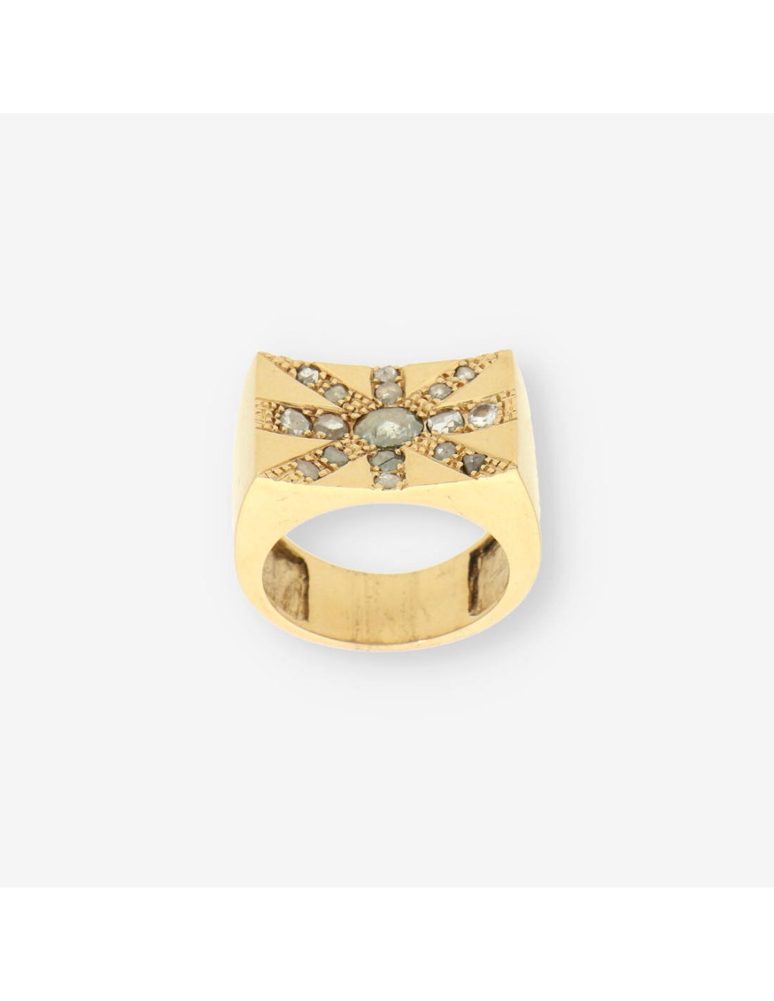 Anillo en oro amarillo de 18 quilates con un peso de 13.1 gramos y talla 16. Este diseño destaca por su distintivo trabajo con diamantes. Una joya de segunda mano que combina lujo y sofisticación, ideal para quienes aprecian la exclusividad en cada detalle.