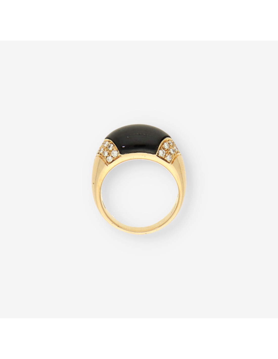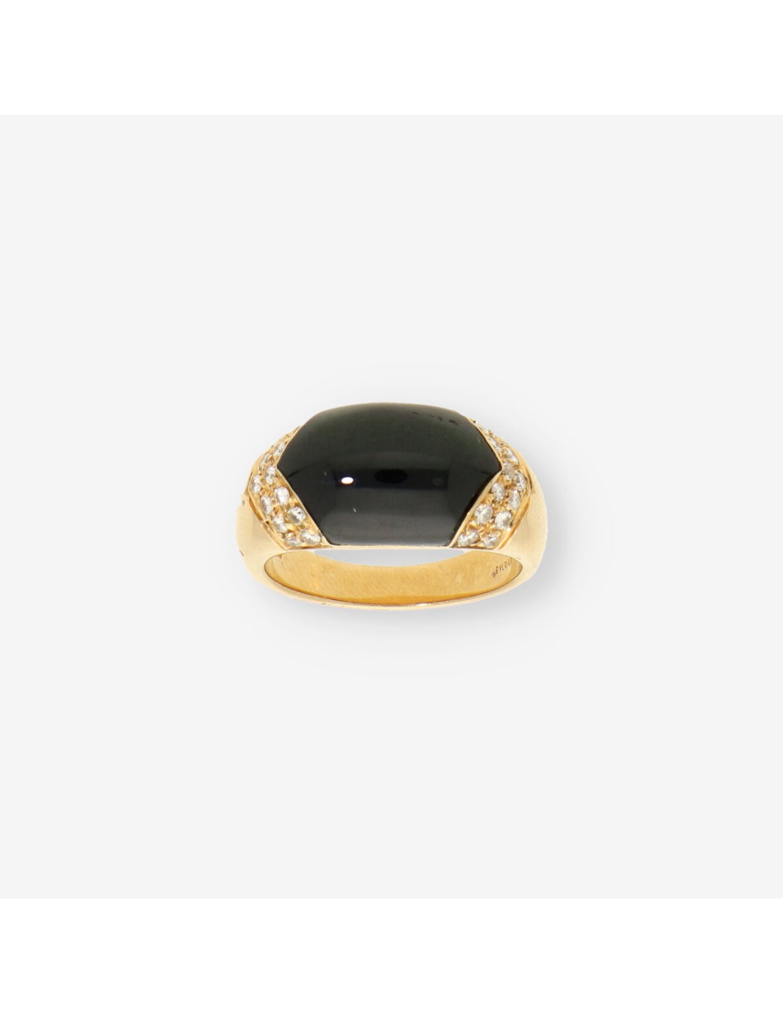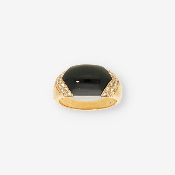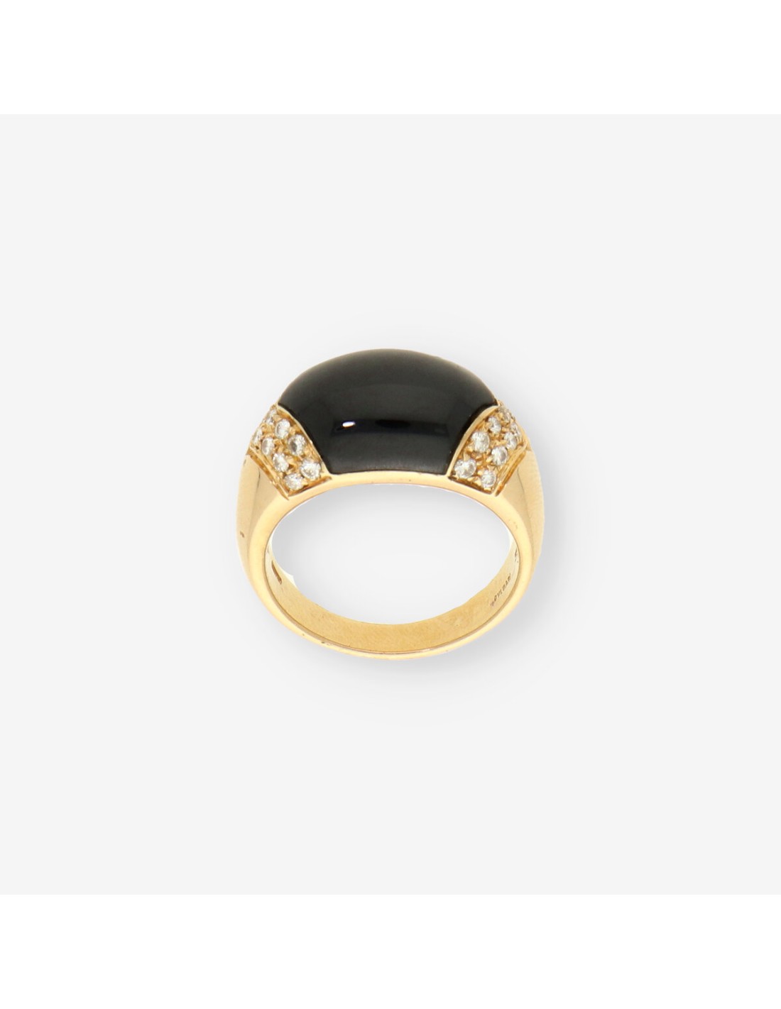 Preciosos anillo Bulgari Tronchetto está elaborado en oro de primera ley, diseñado con una gran piedra negra central y adornado con diamantes a los lados. Es una pieza de segunda mano que mantiene el estilo distintivo de Bulgari, combinando lujo y elegancia. Con un peso de 10,9 gramos y en talla 14, este anillo ofrece una apariencia sólida y refinada, ideal para quienes buscan una joya icónica y sofisticada.