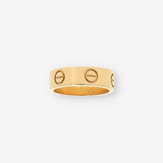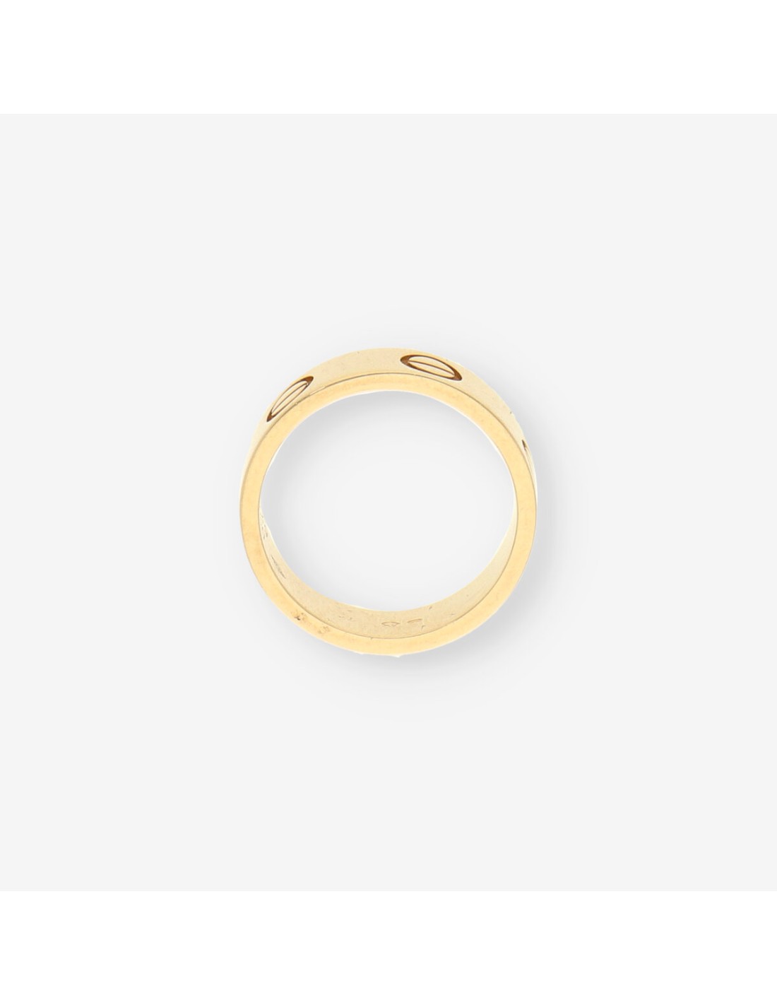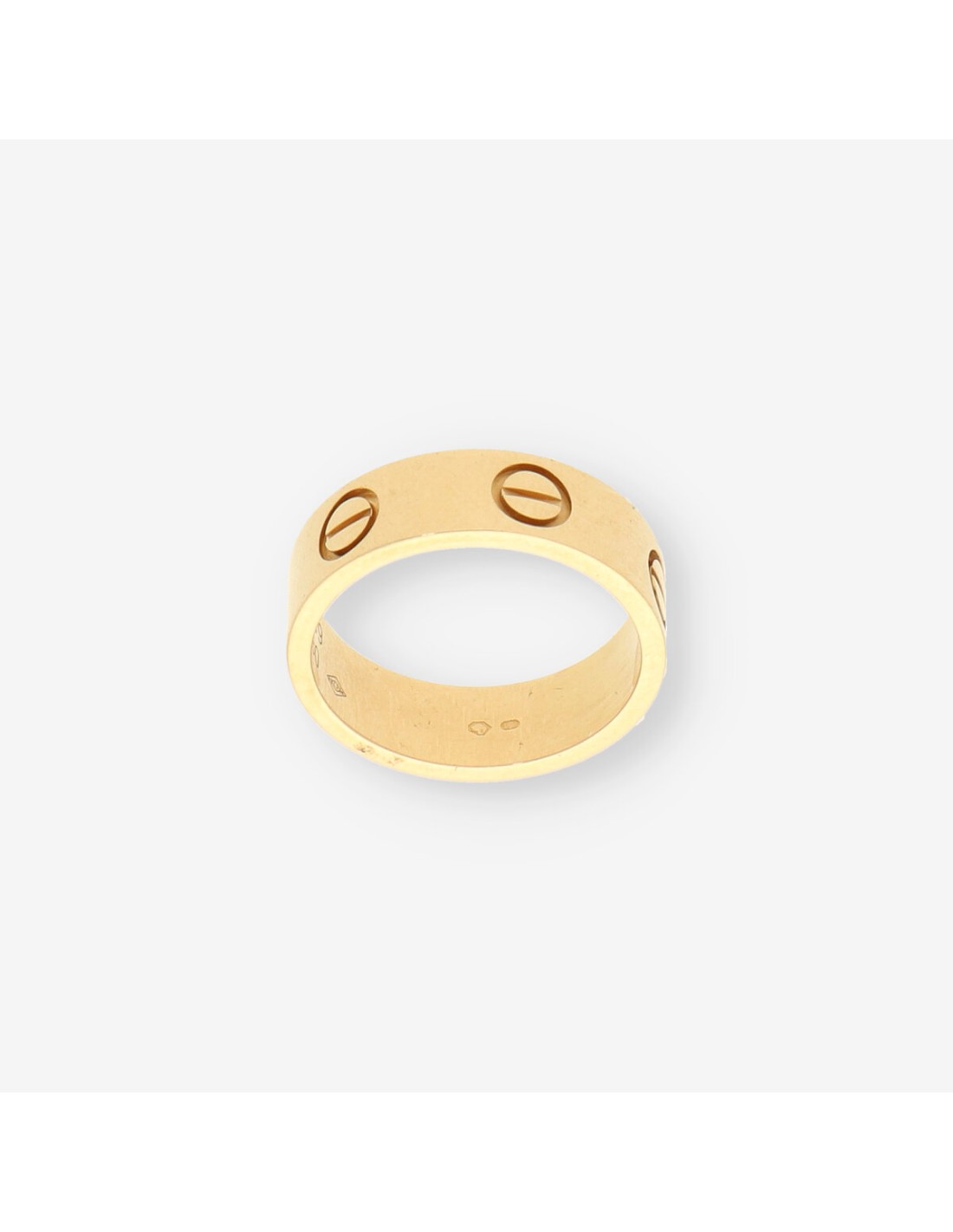 Elegante anillo Cartier Love de segunda mano en perfecto estado de conservación. Fabricado en oro amarillo de 18 quilates con un peso de 5,28 gramos. Talla 49. Diseño icónico con motivos de tornillos. Ideal para ocasiones especiales o como pieza de lujo diaria.