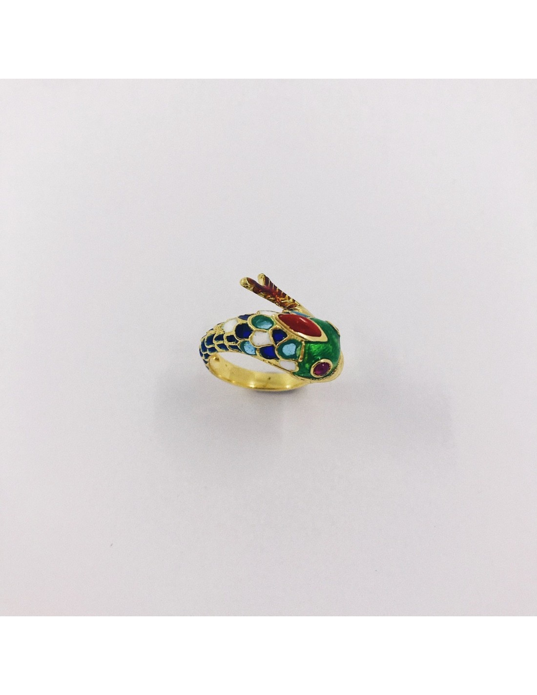 Precioso anillo con forma de pez de segunda mano en oro amarillo de primera ley con piedras de colores representando las escamas y rubís como ojos. Una pieza que atrapa las miradas. Talla: 10. Peso: 5,9gr.