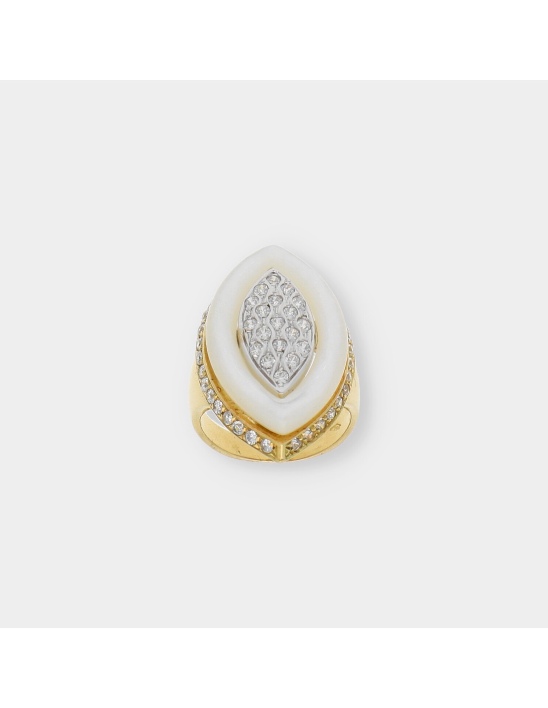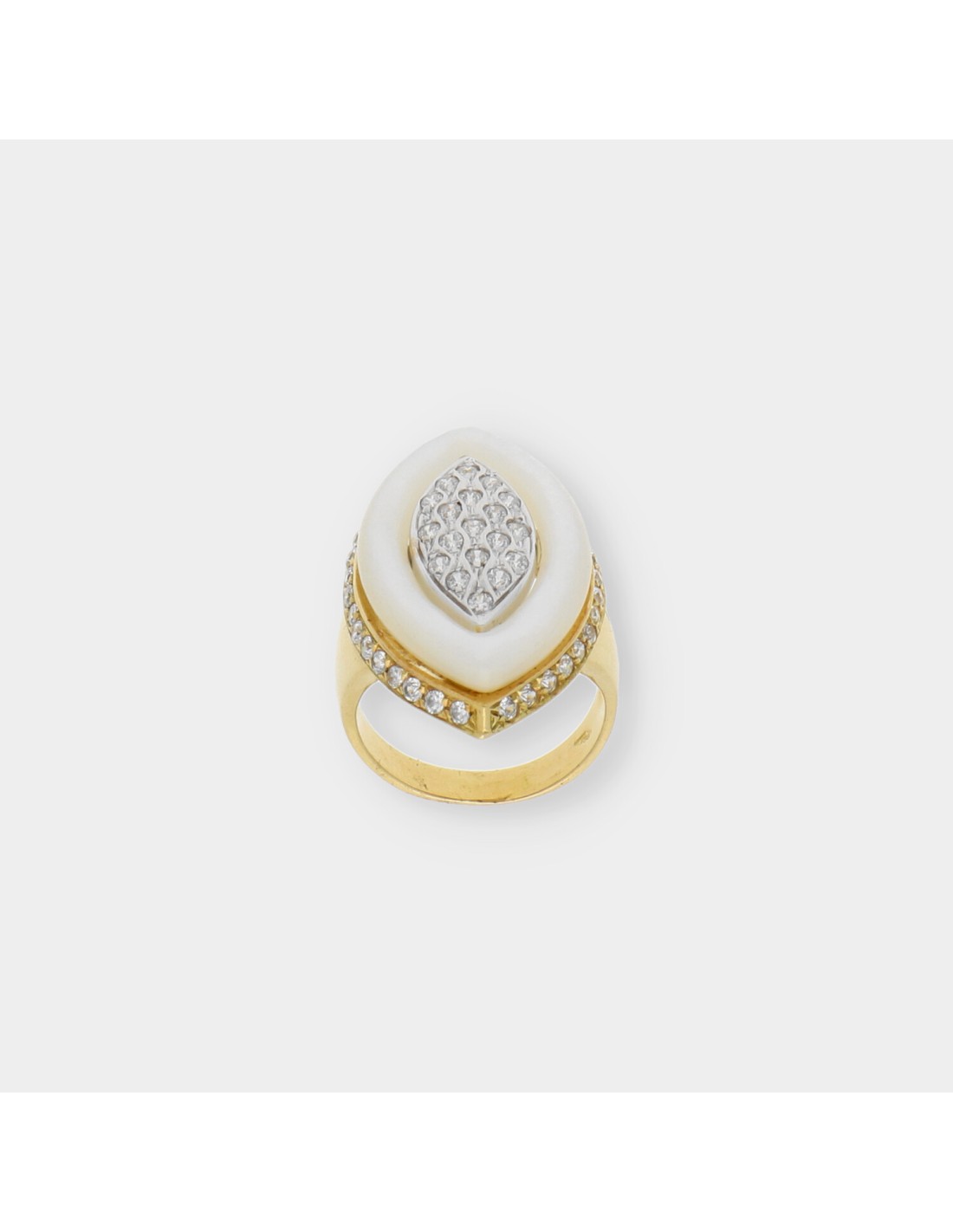 Precioso sello de segunda mano en oro amarillo de primera ley con un acabado rombo con nácar y circonita. Una pieza clásica, ideal para los amantes de los sellos. Talla: 17. Peso: 13.3gr.