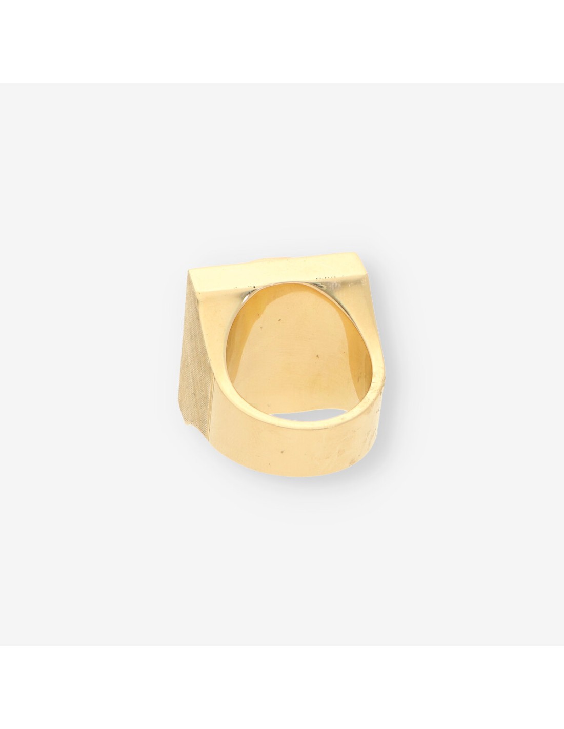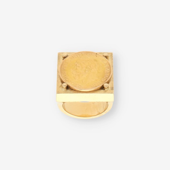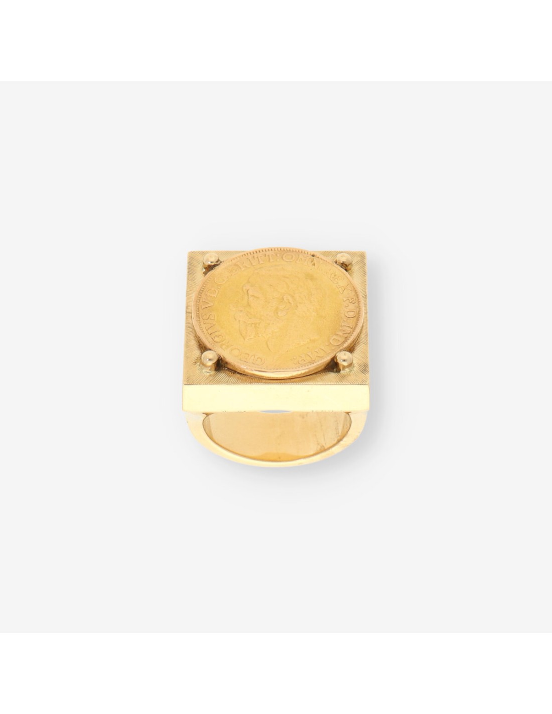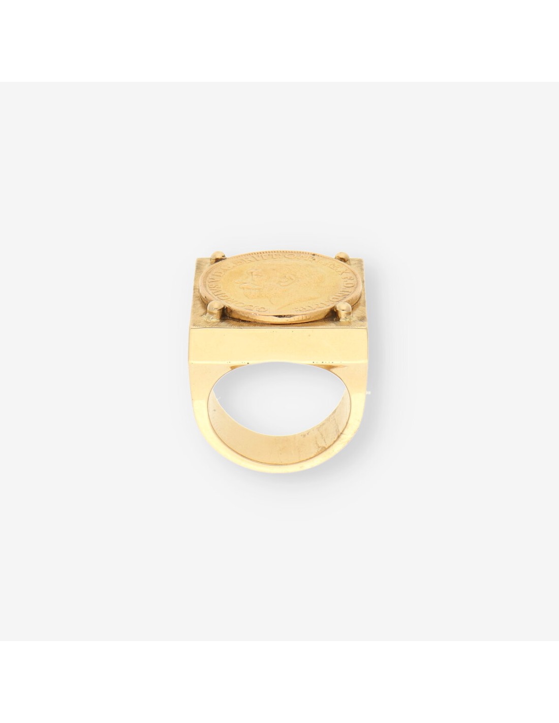 El anillo sello con moneda, de segunda mano, está hecho en oro de primera ley. Tiene una talla 20 y un peso de 37.4 gramos. Este anillo es una pieza distintiva y elegante, caracterizada por la inclusión de una moneda como parte central de su diseño, lo que le confiere un aspecto clásico y atemporal. La robustez del anillo junto con el valor histórico de la moneda lo convierte en una joya especial para coleccionistas o aquellos que buscan una pieza única y con significado.