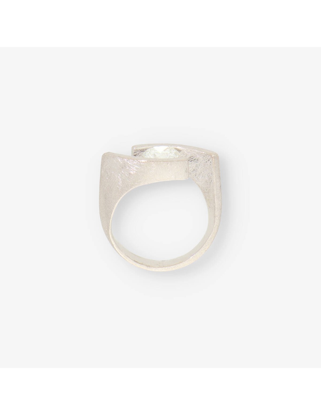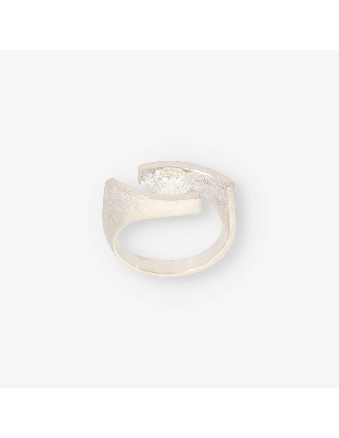 Anillo en oro blanco de primera ley con diamante central en talla brillantes. Talla: 14. Peso diamantes: 1qt. aprox. Peso: 6.6gr.