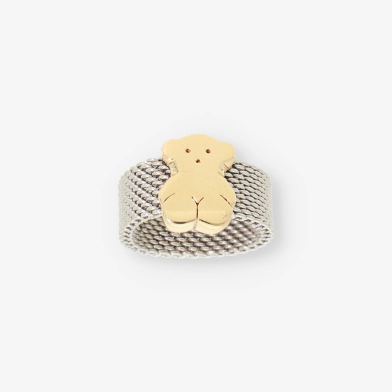 Precioso anillo Tous de segunda mano en malla de acero y oro amarillo de primera ley. Con un diseño clásico de la gran firma Tous éste es una pieza para ser llevada. Talla: 11. Peso: 3.66gr.