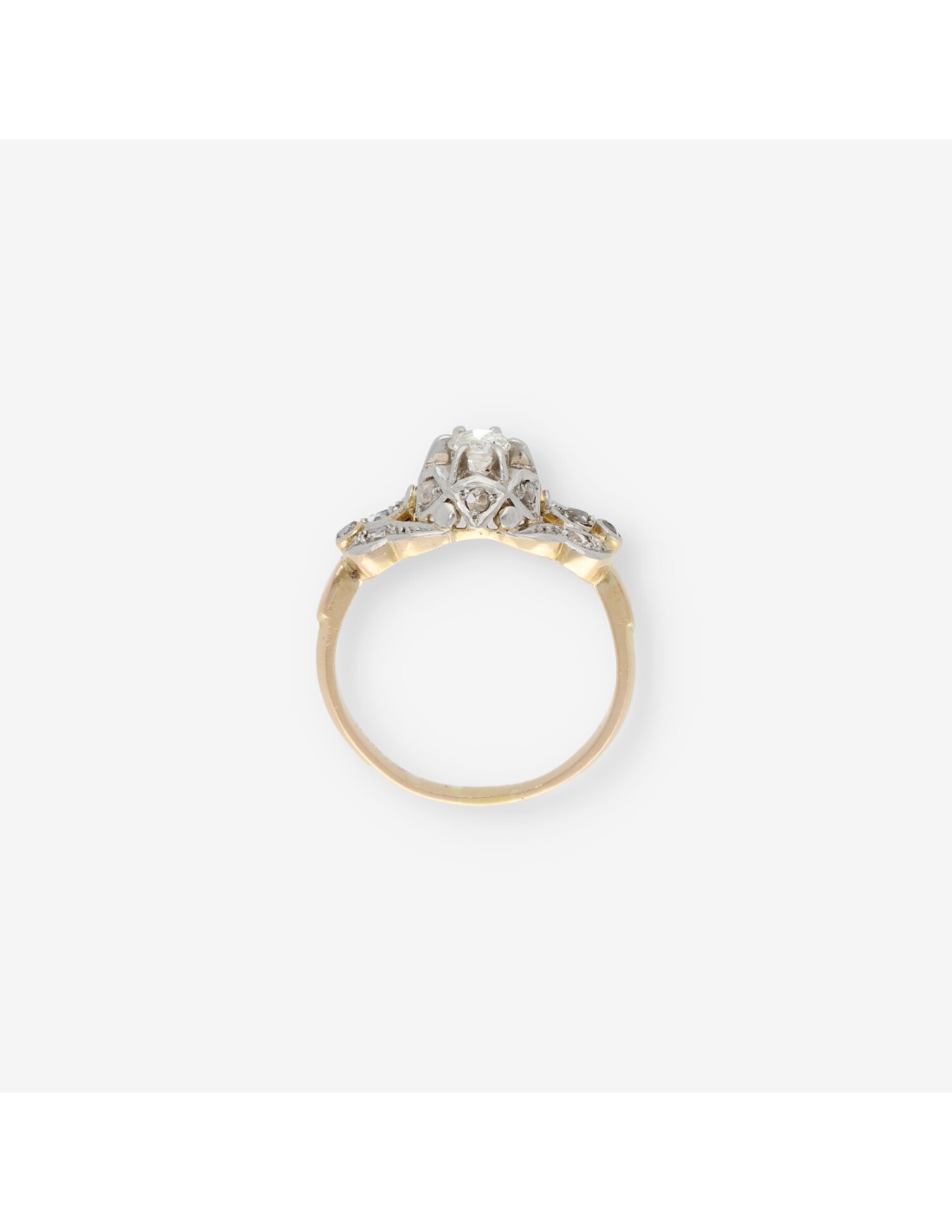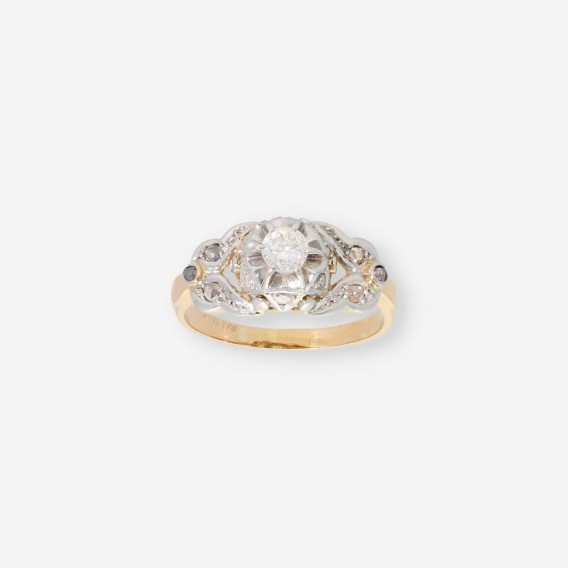 Precioso anillo de segunda mano en oro amarillo de primera ley con diamantes. Preciosa pieza  que guarda tradiciones pasadas, ideal para los amantes de las joyas vintage. Peso: 4.1gr. Talla: 17.