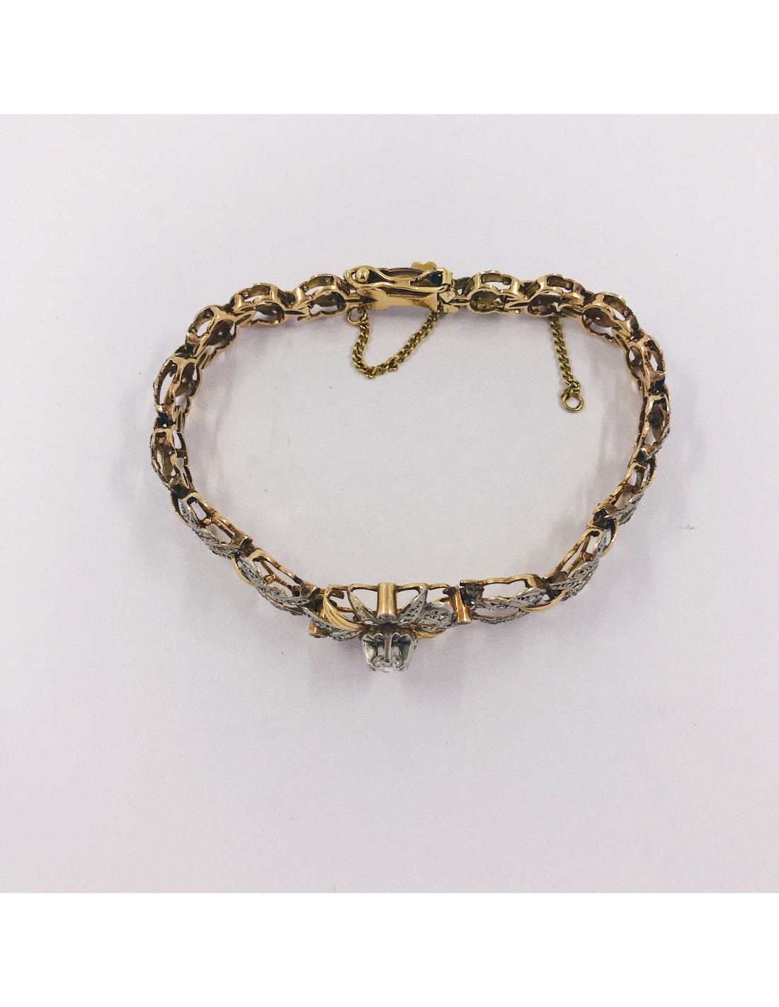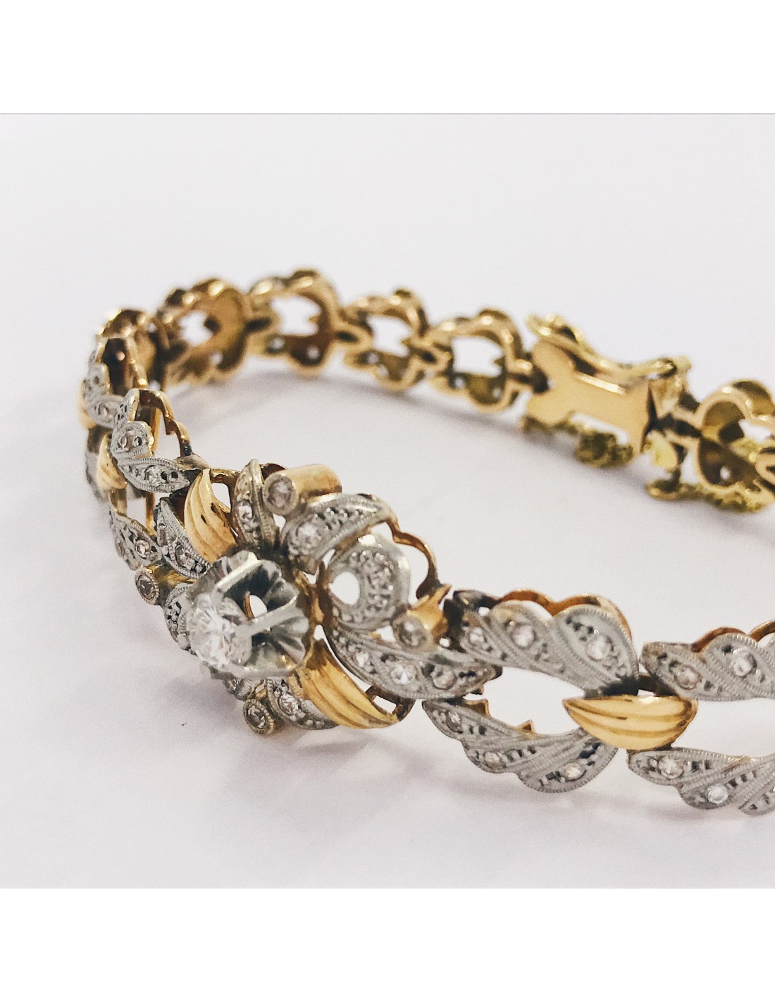 Antigua pulsera de segunda mano en oro blanco y amarillo y brillantes. Peso brillantes central: 0,25 qt. aprox. Longitud: 17,5 cm. Peso: 17,3 gr.