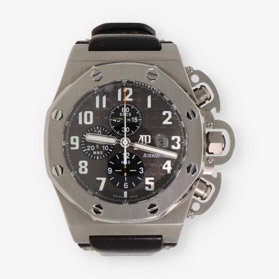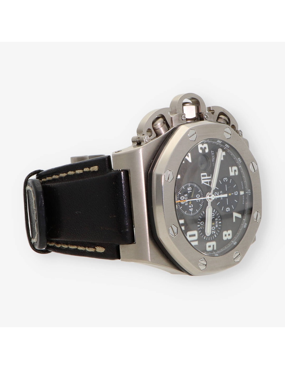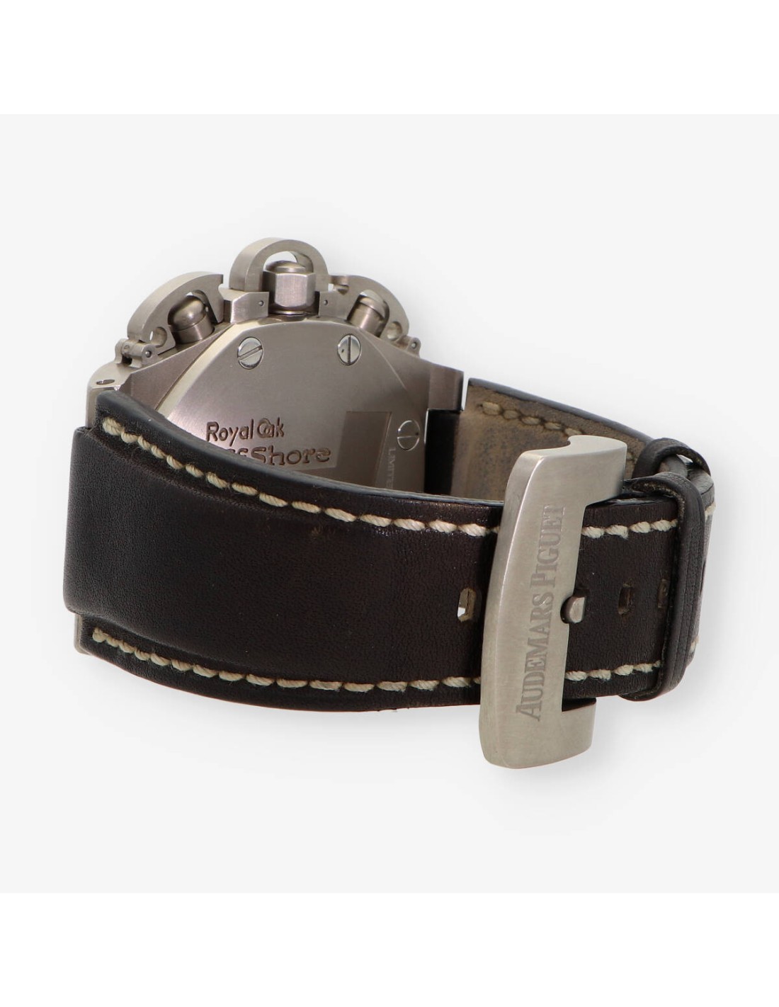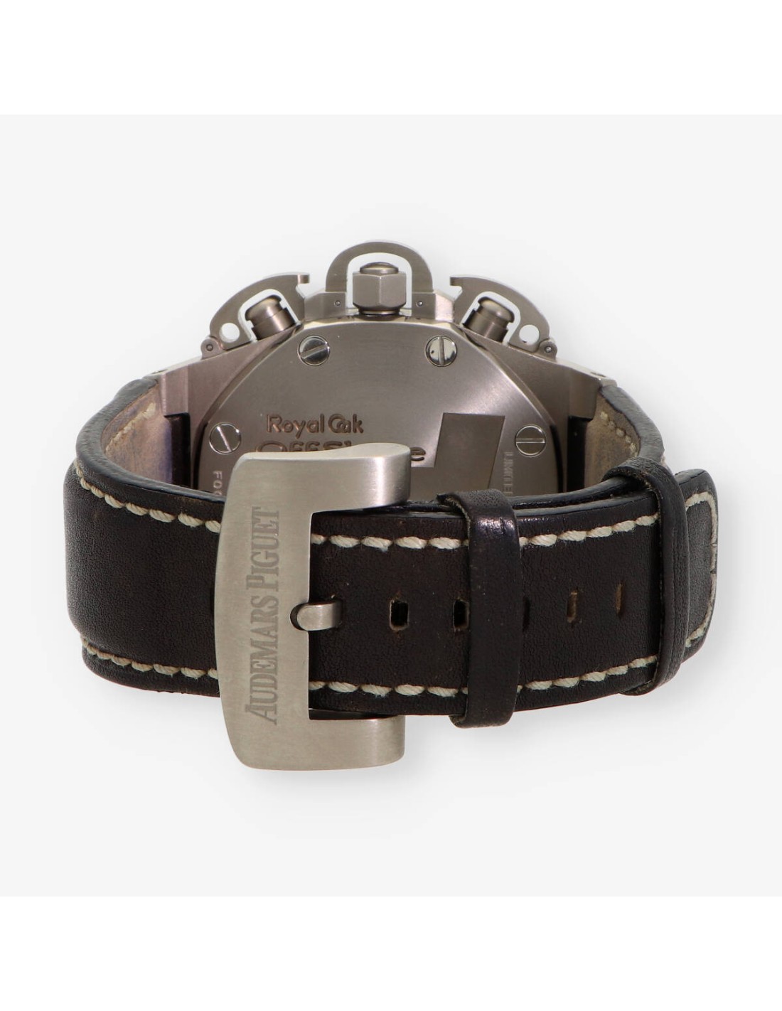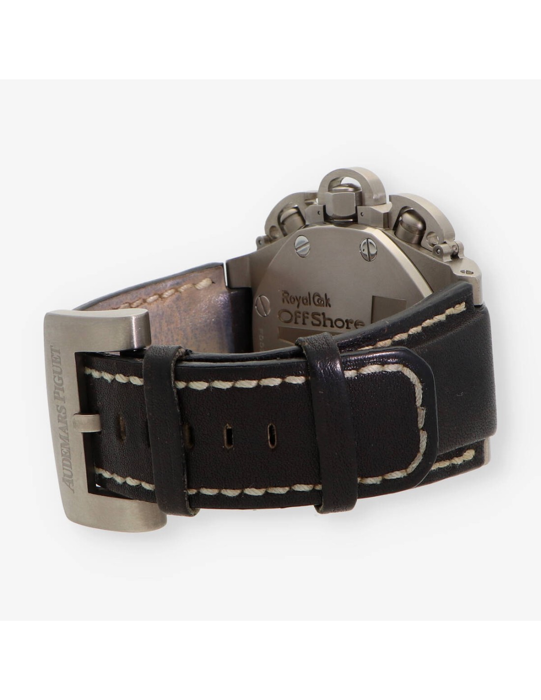 Magnífico Audemars Piguet Royal Oak Offshore de segunda mano en perfecto estado de conservación, con caja de titanio. Fondo atornillado, corona roscada, cristal zafiro. Esfera color negro con números árabes y agujas luminiscentes. Fecha a las 3. Mecanismo automático. Pulsera de piel con cierre de hebilla. Incluye caja original y documentos.