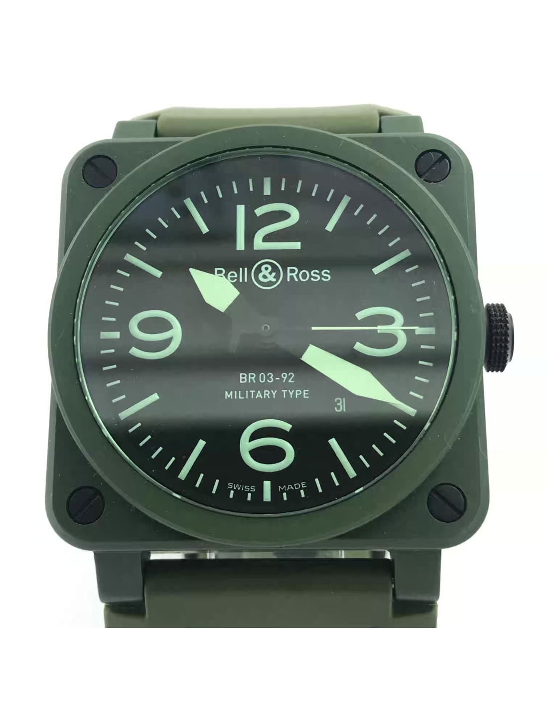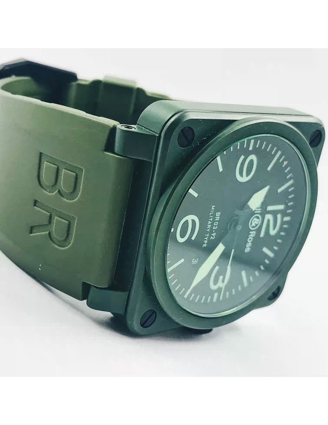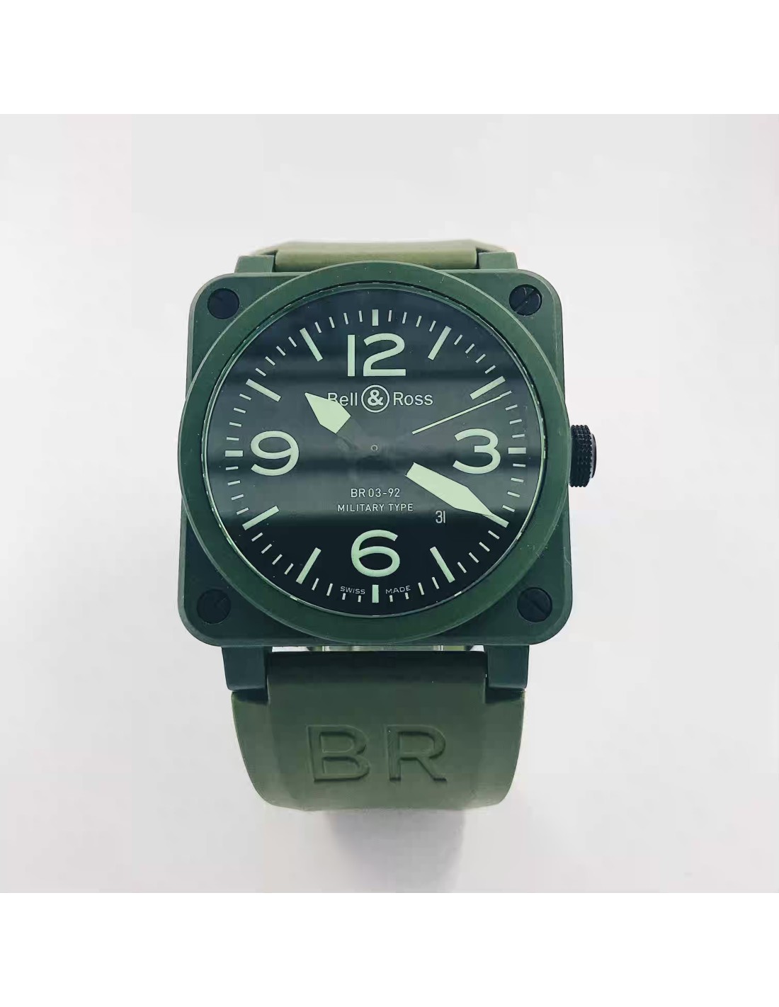 Magnifico Bell & Ross Aviation de segunda mano en perfecto estado de marcha y conservación. Ref: BR 03-92-CK-00036. Caja de 42mm y 10mm de alto en acero con cuerda automática del calibre BR-CAL.302 y 42h de reserva de marcha, resistencia al agua de 10 atmosféras, cristal zafiro y fondo negro con números árabigos con el calendario entre las 4 y 5. Bisel en cerámico, correa en caucho verde y cierre en acero.