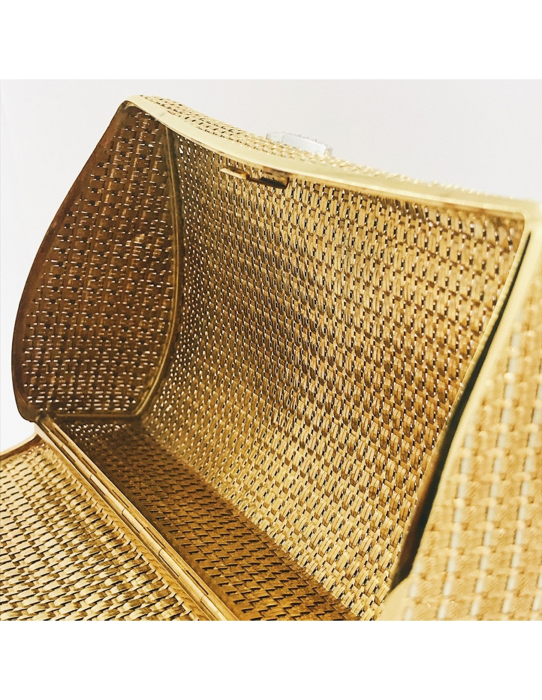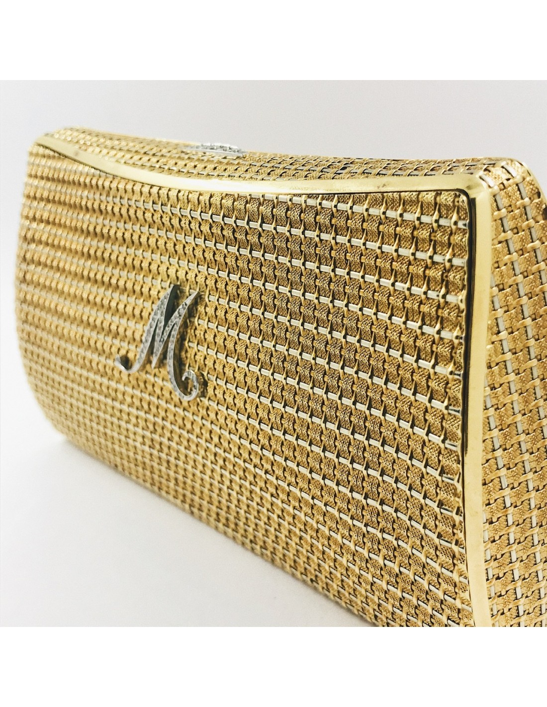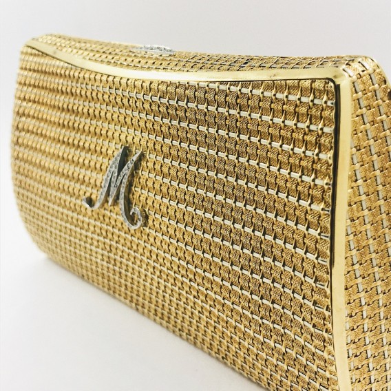 Impresionante bolso vintage de segunda mano en oro amarillo y blanco de primera ley. Un magnifico bolso de señora del siglo pasado hecha en su totalidad de oro de 18 quilates y tanto la letra M en el centro como el cierre a botón están en oro blanco con brillantes. Desde luego es una pieza que no deja indiferente a aquellos que lo ven. Largo: 15cm. Ancho maximo: 4,3cm. Peso: 242,10gr.