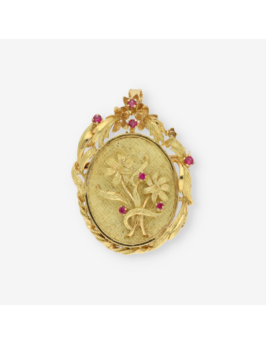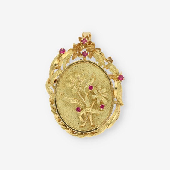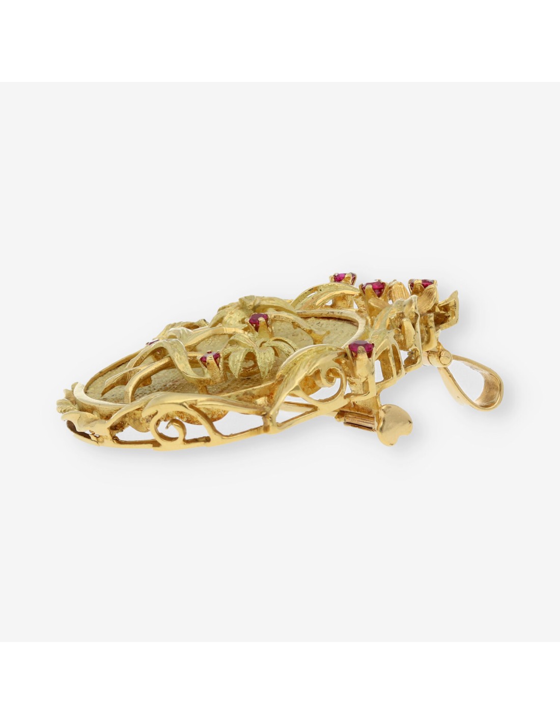 Broche colgante de segunda mano en en oro de 18 kt. y piedras rojas. Medidas: 4 x 3 cm. Peso: 10,5 gr.