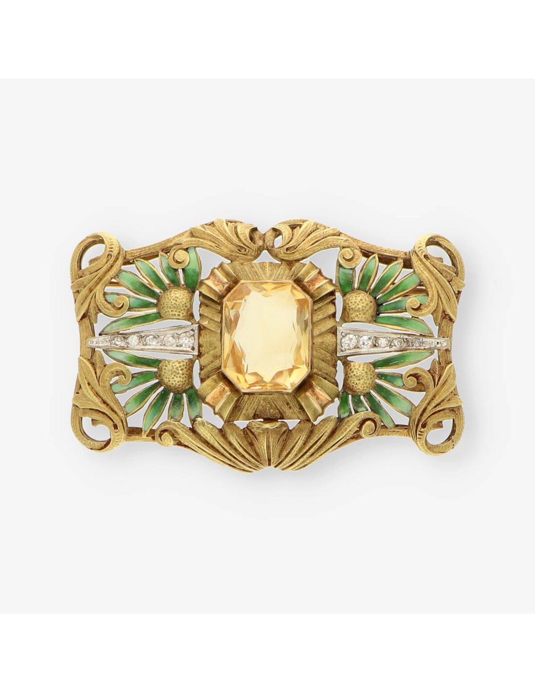 Descubre nuestro exclusivo broche vintage de segunda mano en oro amarillo de primera ley. Con un diseño intrincado de esmalte verde y detalles en oro, este broche presenta una gema amarilla facetada en su centro, junto con diamantes incrustados para un acabado deslumbrante. Con un peso de 20.3 gramos y unas dimensiones de 5.5 cm x 3 cm, es perfecto para ocasiones especiales. Añade un toque de distinción a tu estilo con este impresionante broche vintage.