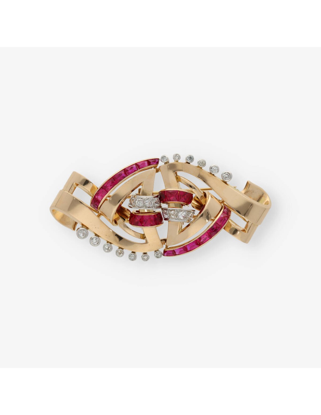 Pecioso broche de segunda mano en oro amarillo de primera ley. con brillantes y piedras de color. Medidas: 6.8cm. X 3.2cm. Peso: 33.8gr.