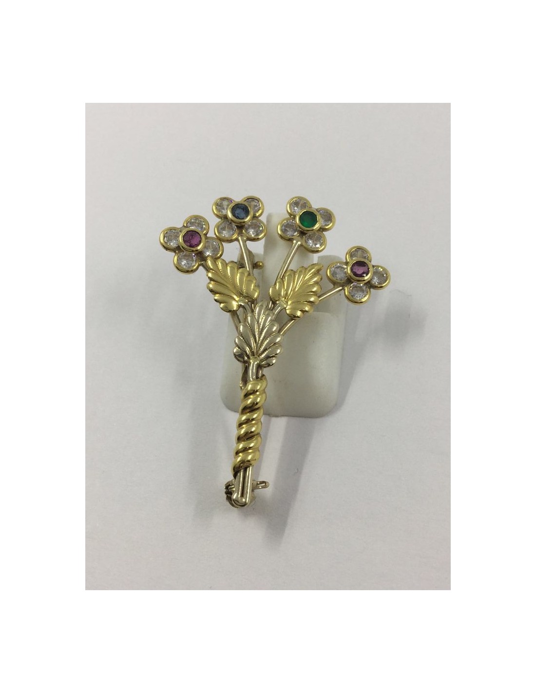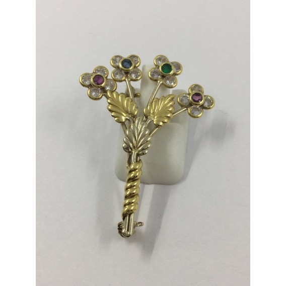 Broche de ocasión en oro de 18 kt., circonitas y piedras de color, en forma de ramo de flores. Medidas: 4 x 3 cm. Peso: 4,3 gr.