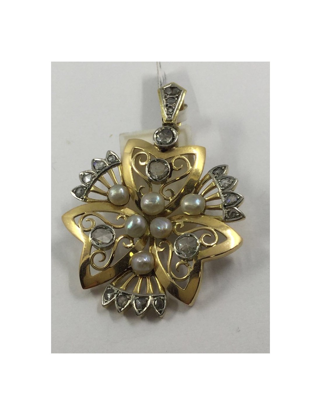 Broche de ocasión en oro de 18 kt. con diamantes y perlas. Medidas: 5,2 x 3,8 cm. Peso: 13,4 gr.