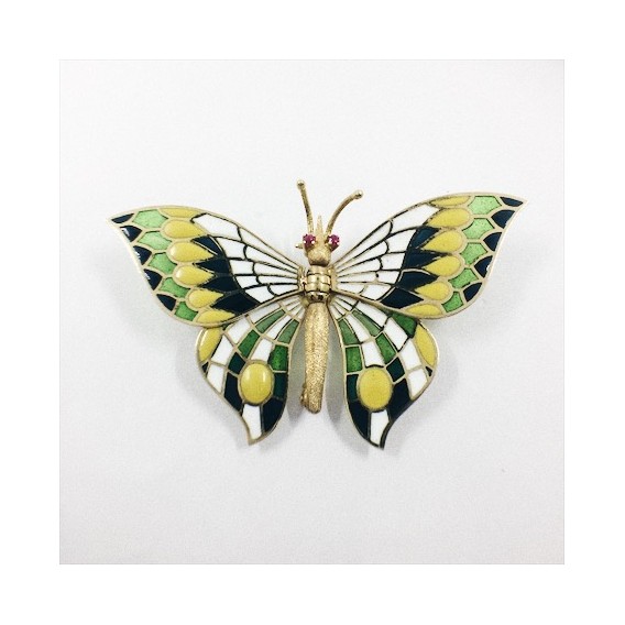 Broche de segunda mano en oro amarillo de 18 kt. y esmaltes, en forma de mariposa. Alas móviles y piedras color rojo en los ojos. Medidas: 65 x 36 mm. Peso: 10,1 g.