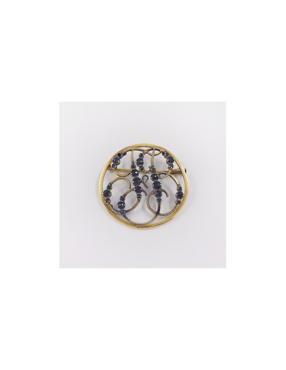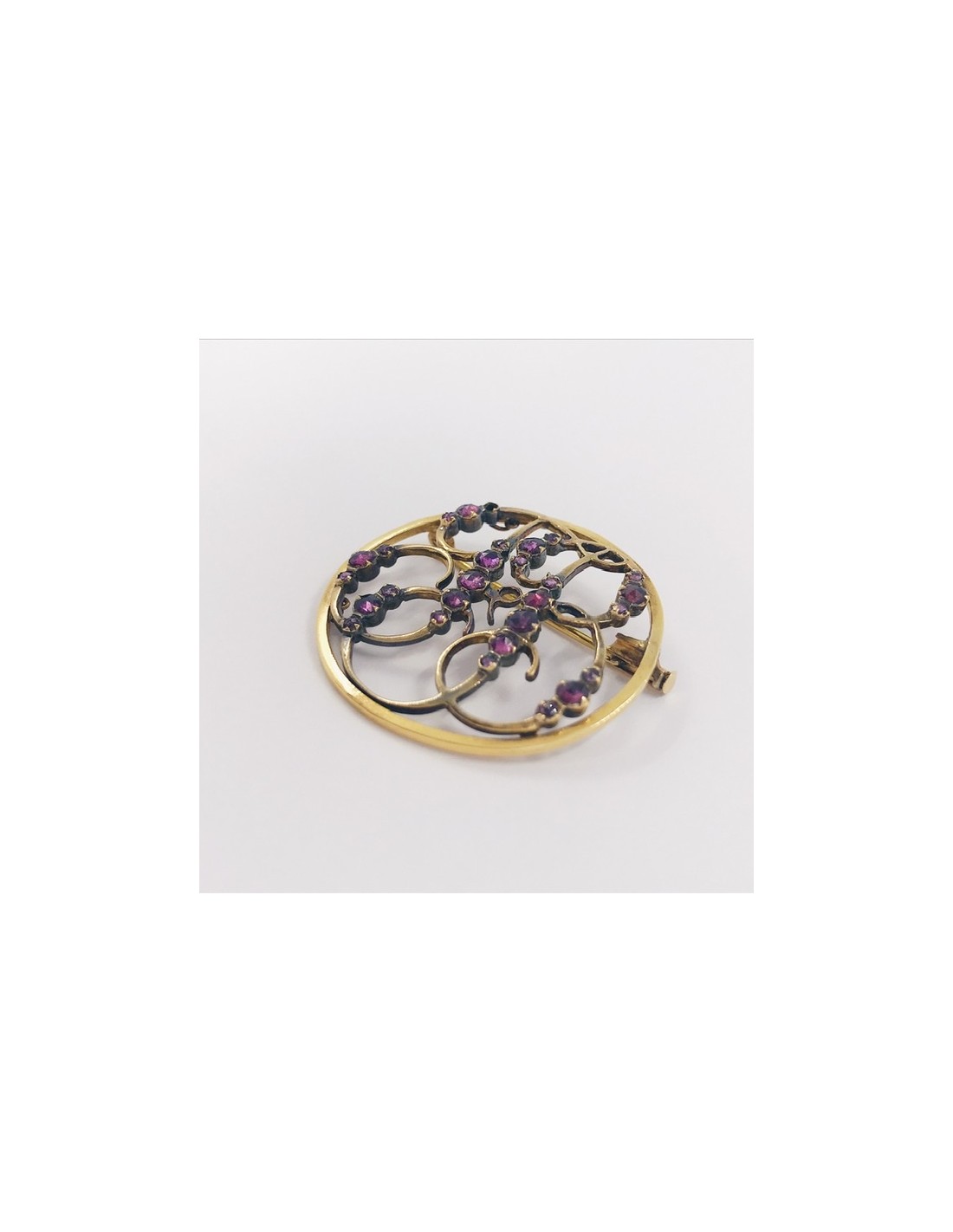 Broche de ocasión en oro de 18 kt. y piedras de color. Diámetro: 3,7 cm. Peso: 7,9 gr.