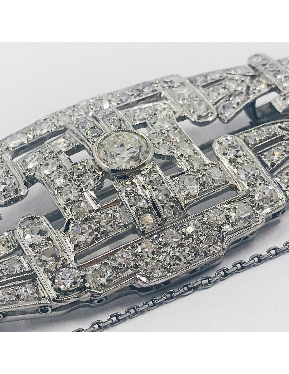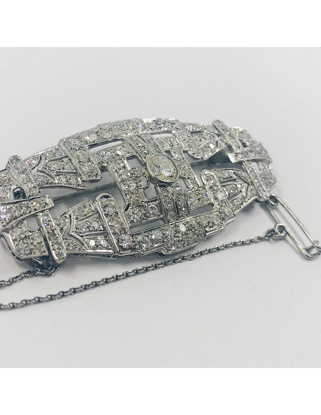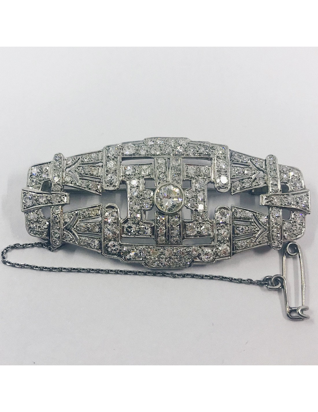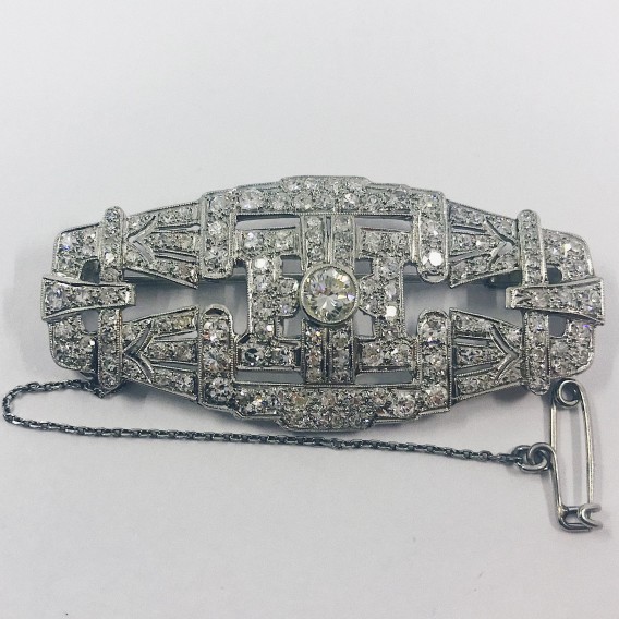 Broche de platino con un brillante central y brillantes cubriendo toda la pieza. De estilo años 20. Una joya antigua y al mismo tiempo elegante. Ancho: 5,5cm. Alto: 2,5cm. Peso: 14gr.