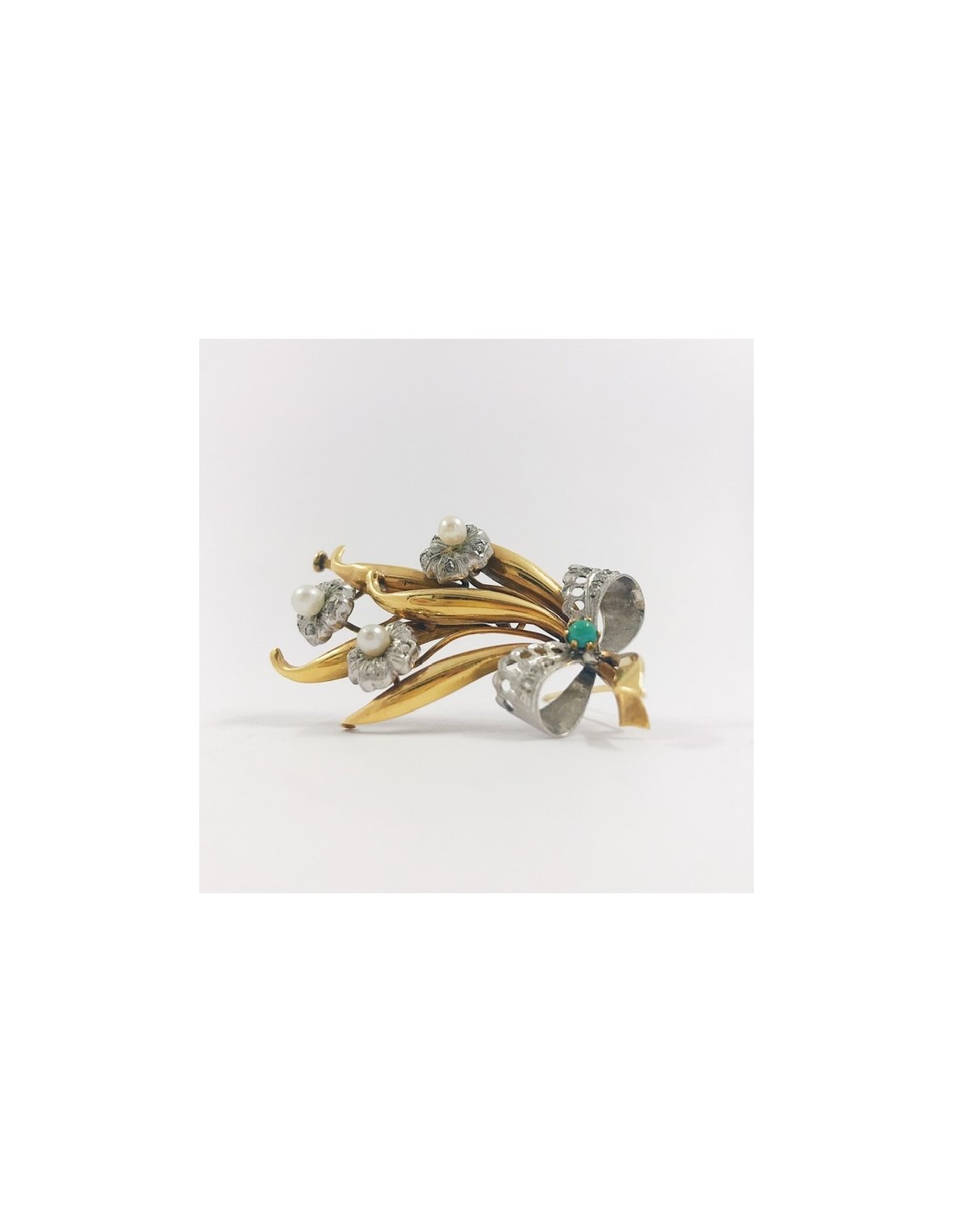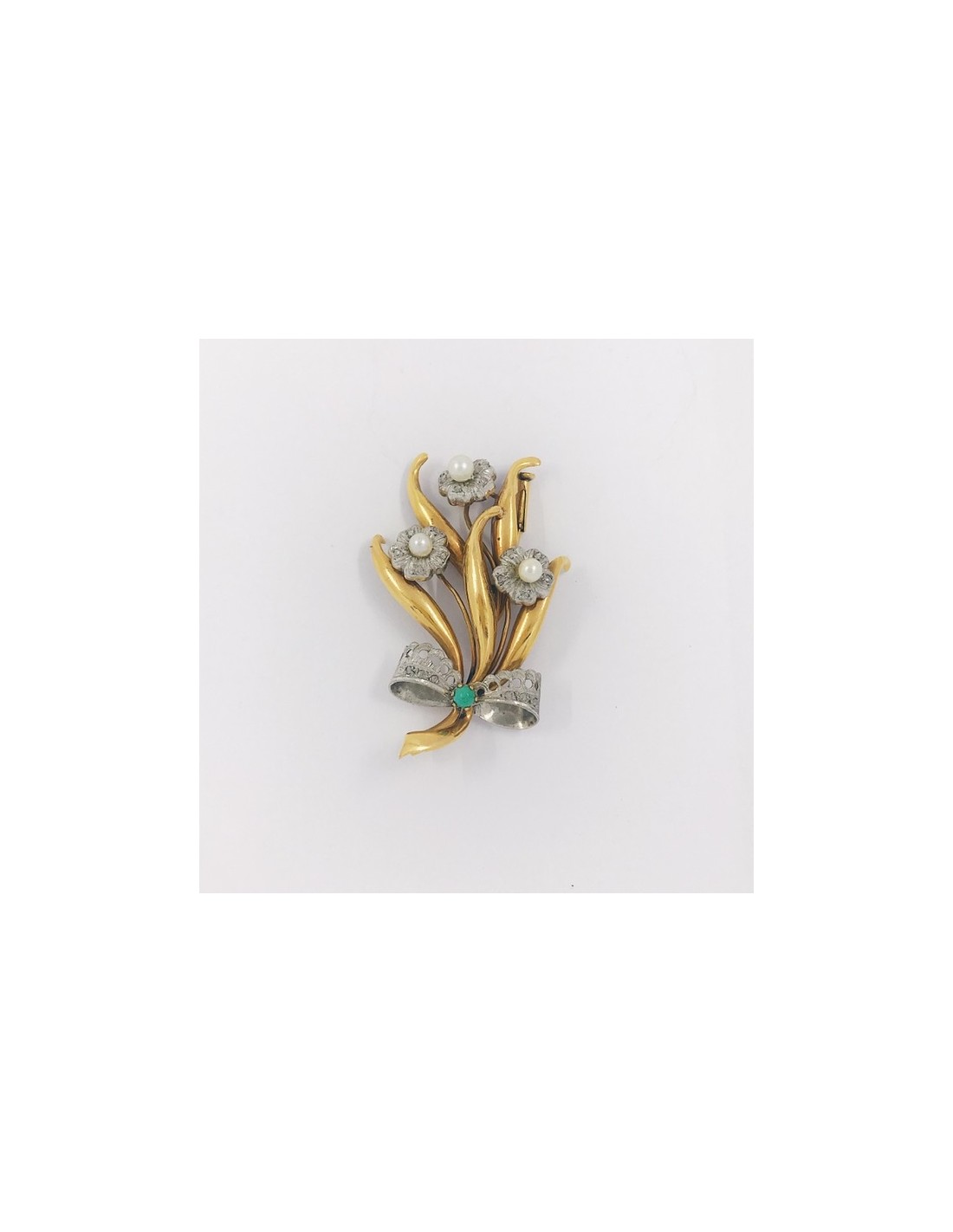 Broche de ocasión en oro de 18 kt., brillantes y perlitas. Medidas: 5 x 3 cm. Peso: 8 gr.
