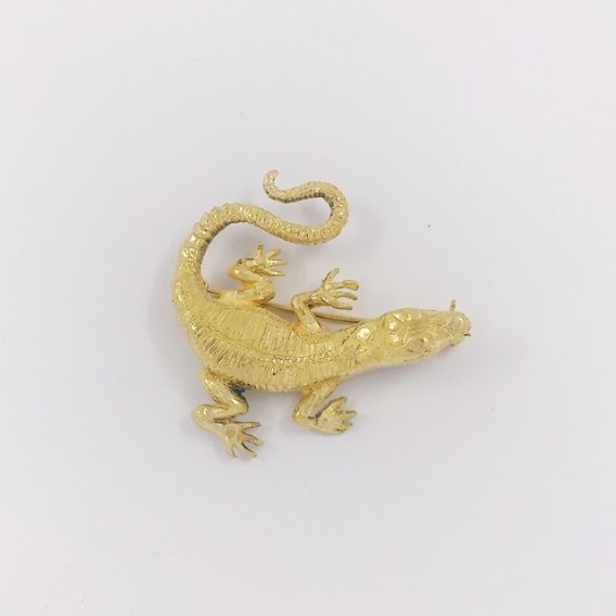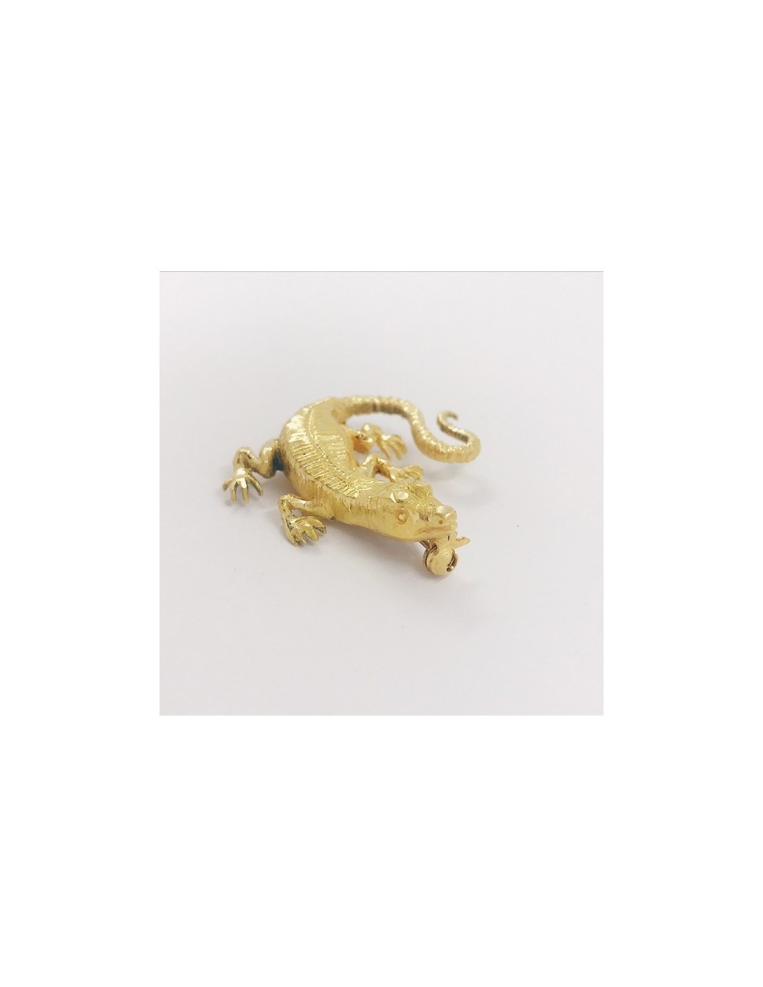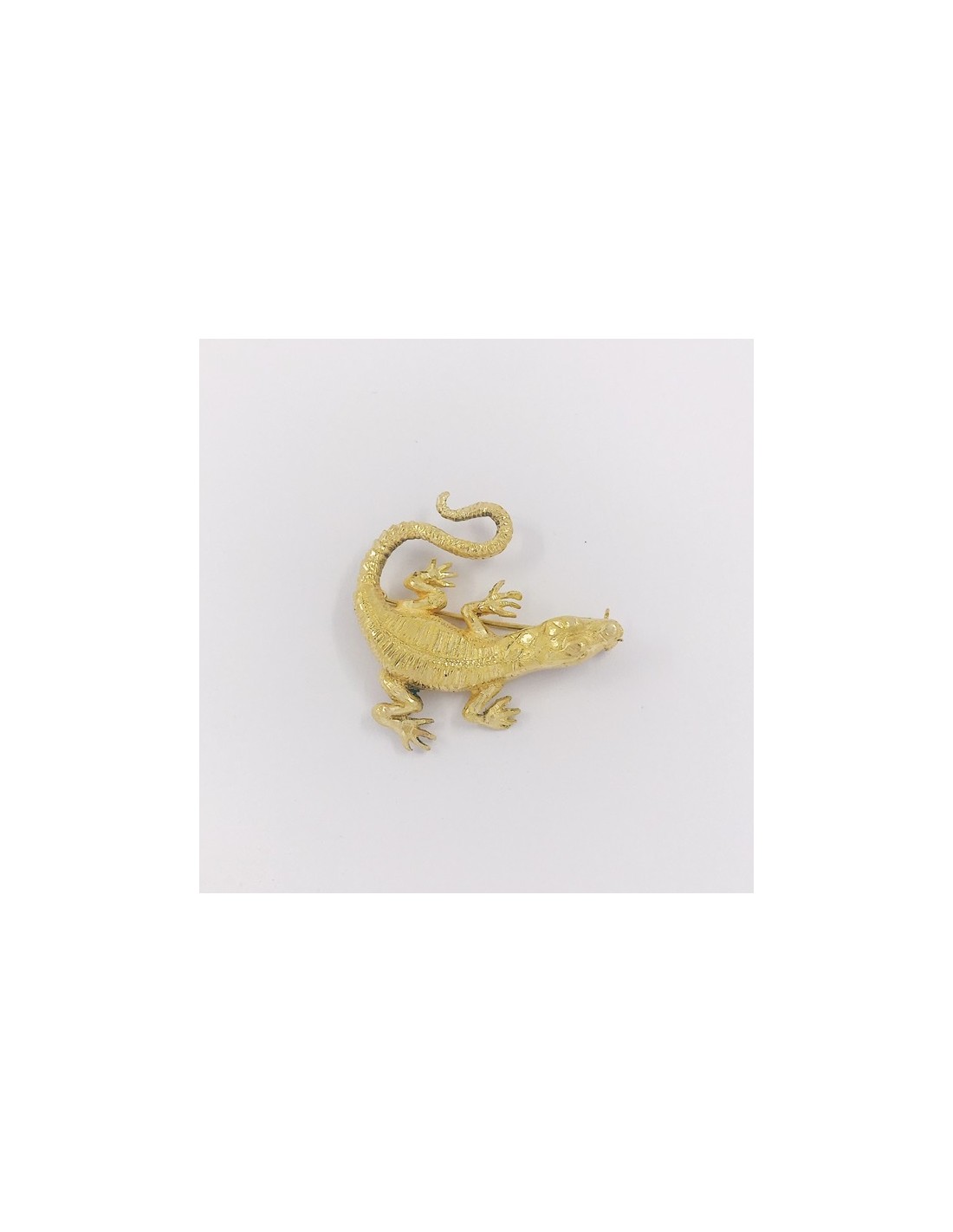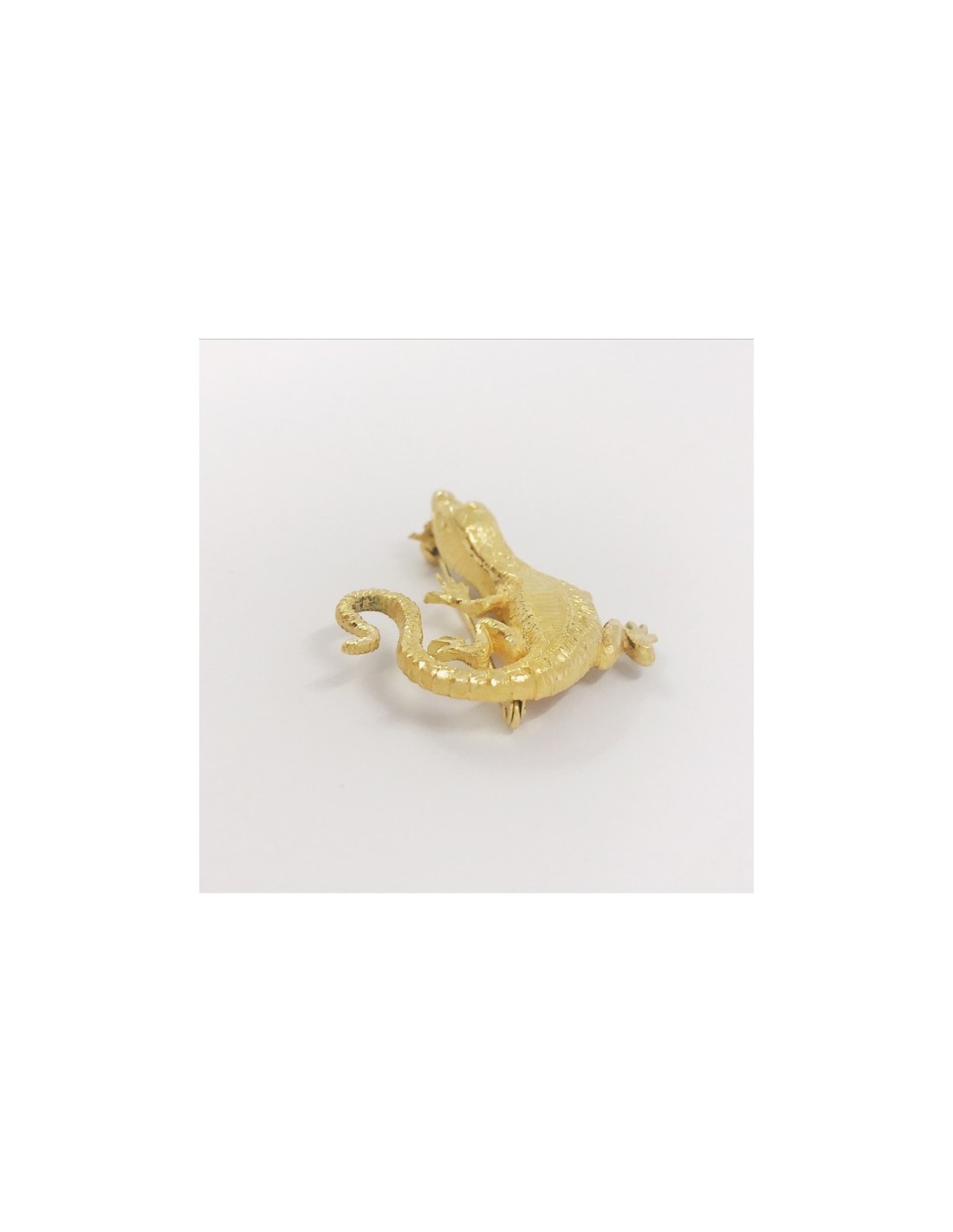 Precioso broche de segunda mano con forma de lagartija y en oro amarillo de primera ley. Una magnifica pieza que no pasa desapercivido. Largo: 3.5cm. Ancho: 3.5cm. Peso: 10.1gr.