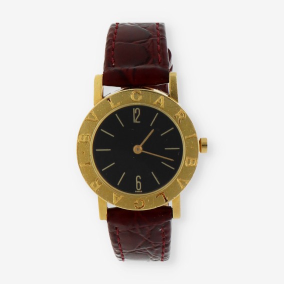 Magnifico reloj Bulgari de segunda mano en perfecto estado de marcha y conservación. Con movimiento de cuarzo y caja de 26mm en oro de primera ley con cristal zafiro y fondo negro sin números. Correa roja de piel y cierre en de hebilla en oro amarillo.