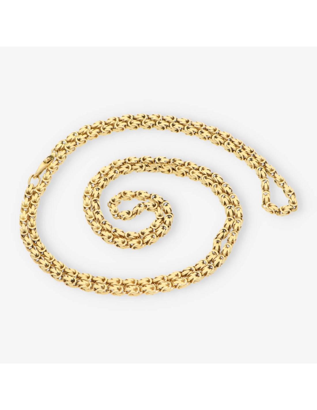 Preciosa cadena de segunda mano en oro amarillo de primera ley con cierre de mosquetón. Una pieza magnífica para ser lucida en cualquier momento y lugar. Largo: 71.5cm. Ancho: 0.2cm. Peso: 37.5gr.