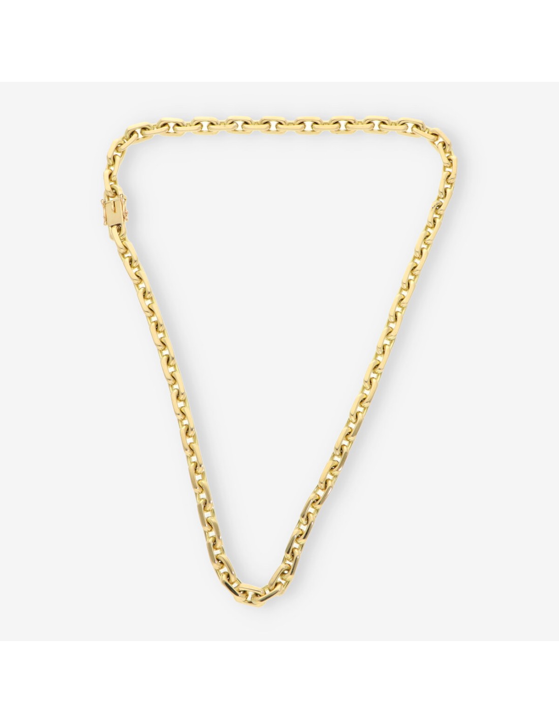 Impresionante cadena de oro amarillo de primera ley (18kt) de segunda mano, con un diseño sólido y elegante. Con una longitud de 49 cm y un ancho de 0.6 cm, esta pieza destaca por su peso de 102.4 gramos, ofreciendo una sensación de lujo y presencia al llevarla. Su cierre de lengüeta asegura una sujeción firme y segura, perfecta para uso diario o para ocasiones especiales. Una joya ideal para los amantes del oro que buscan una pieza robusta y atemporal.