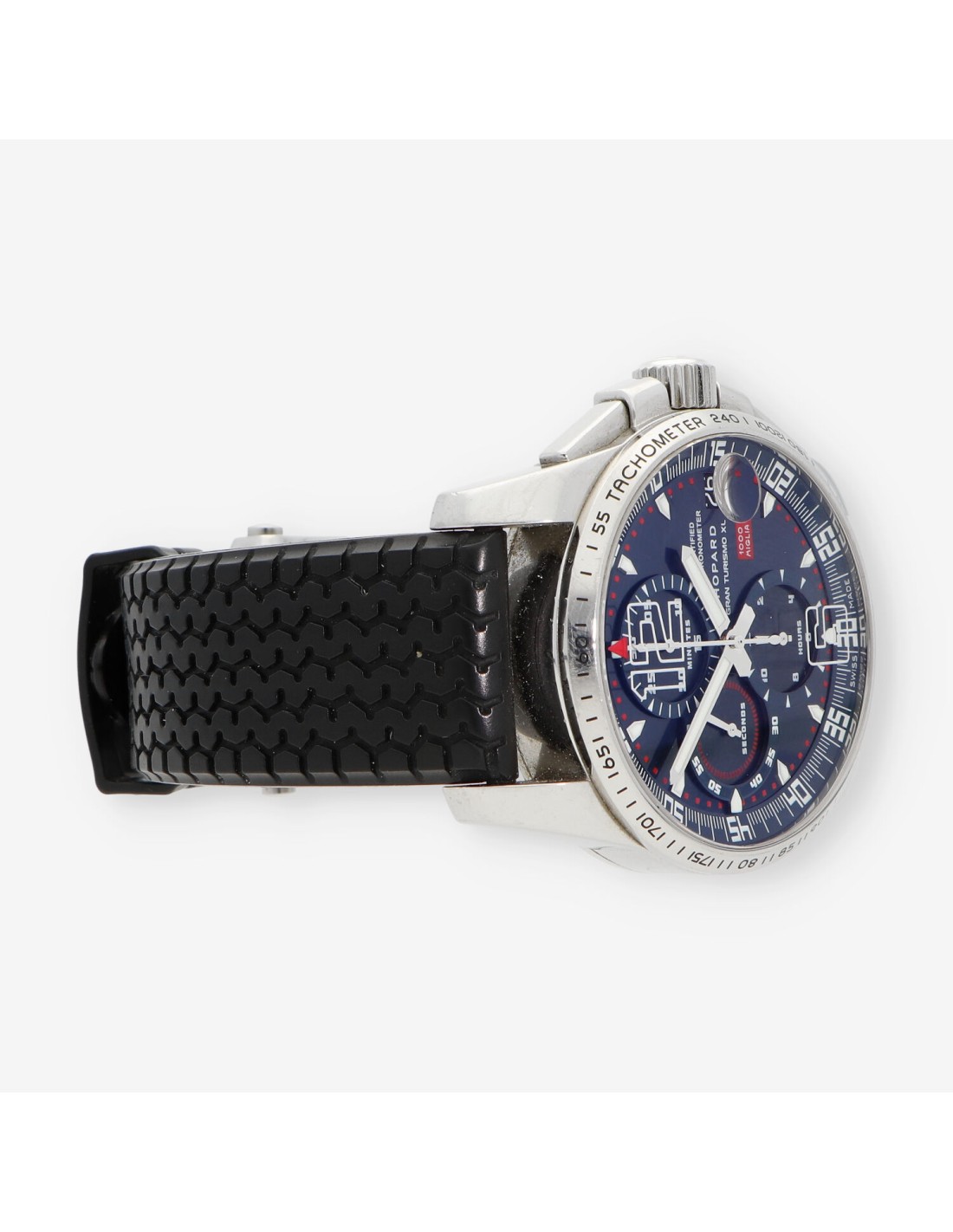 Excelente Chopard Mille Miglia de segunda mano en perfecto estado de marcha y conservación. Reserva de marchas de 46 horas, 25 rubies, Tapa trasera de cristal de zafiro, resistencia al agua de 10 atmósferas, esfera azul con cristal de zafiro, taquímetro grabado en el bisel, cierre desplegable. Edición limitada. Con caja y documentos