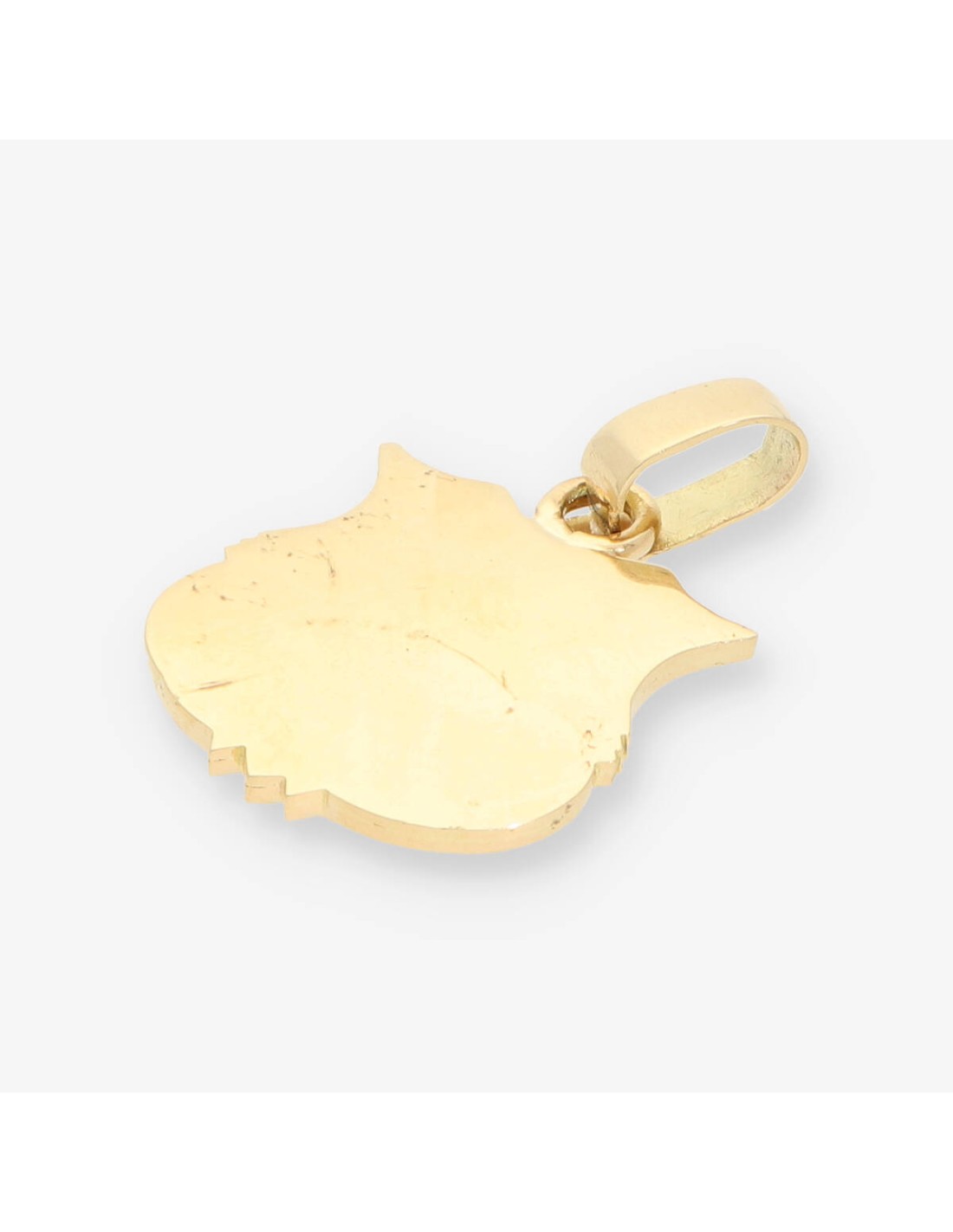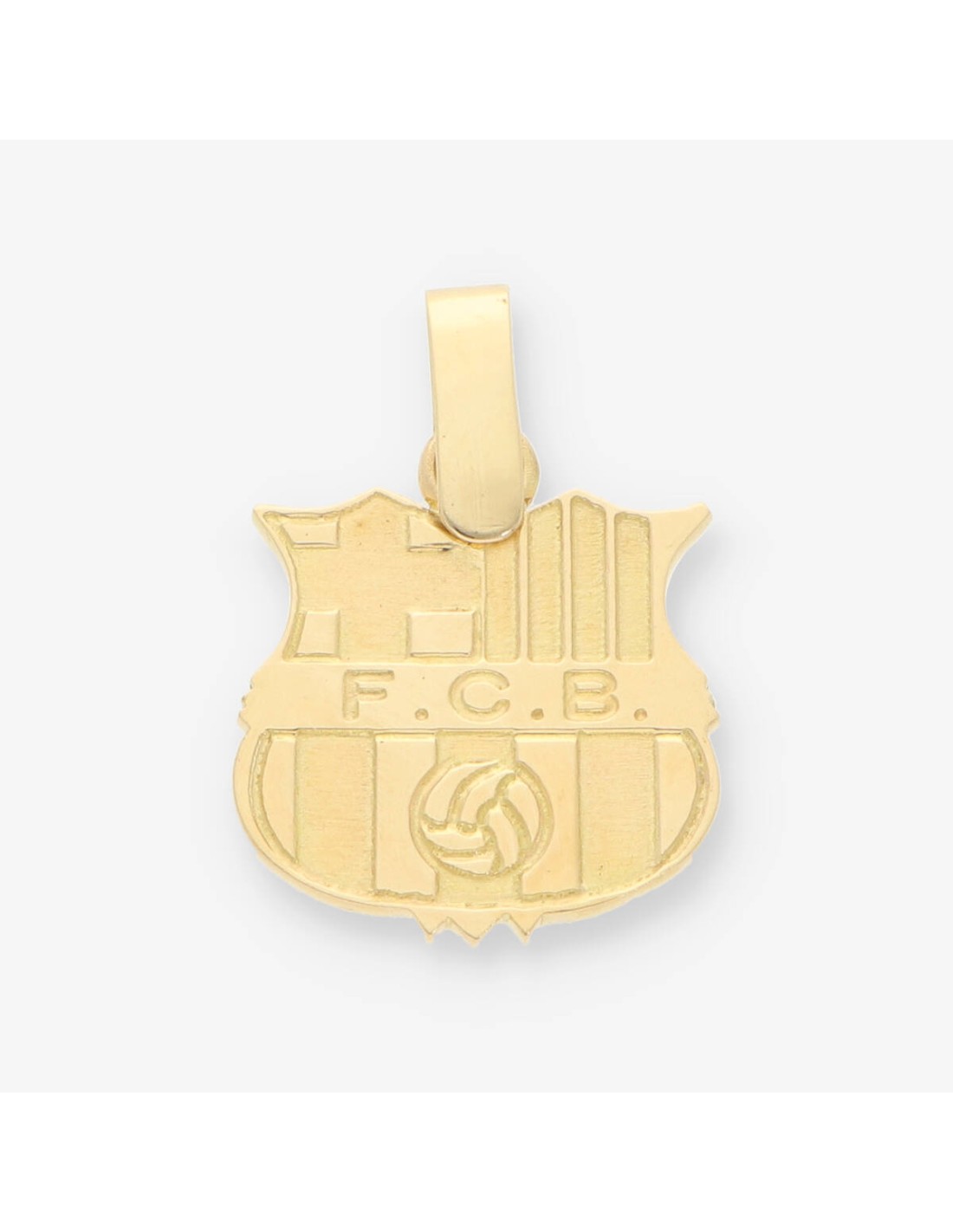 Precioso colgante de segunda mano con el escudo de FC Barcelona en oro amarillo de primera ley. Una pieza clásica, ideal para los amantes del fútbol. Alto: 5cm. Ancho: 3.3cm. Peso: 31.4gr.
