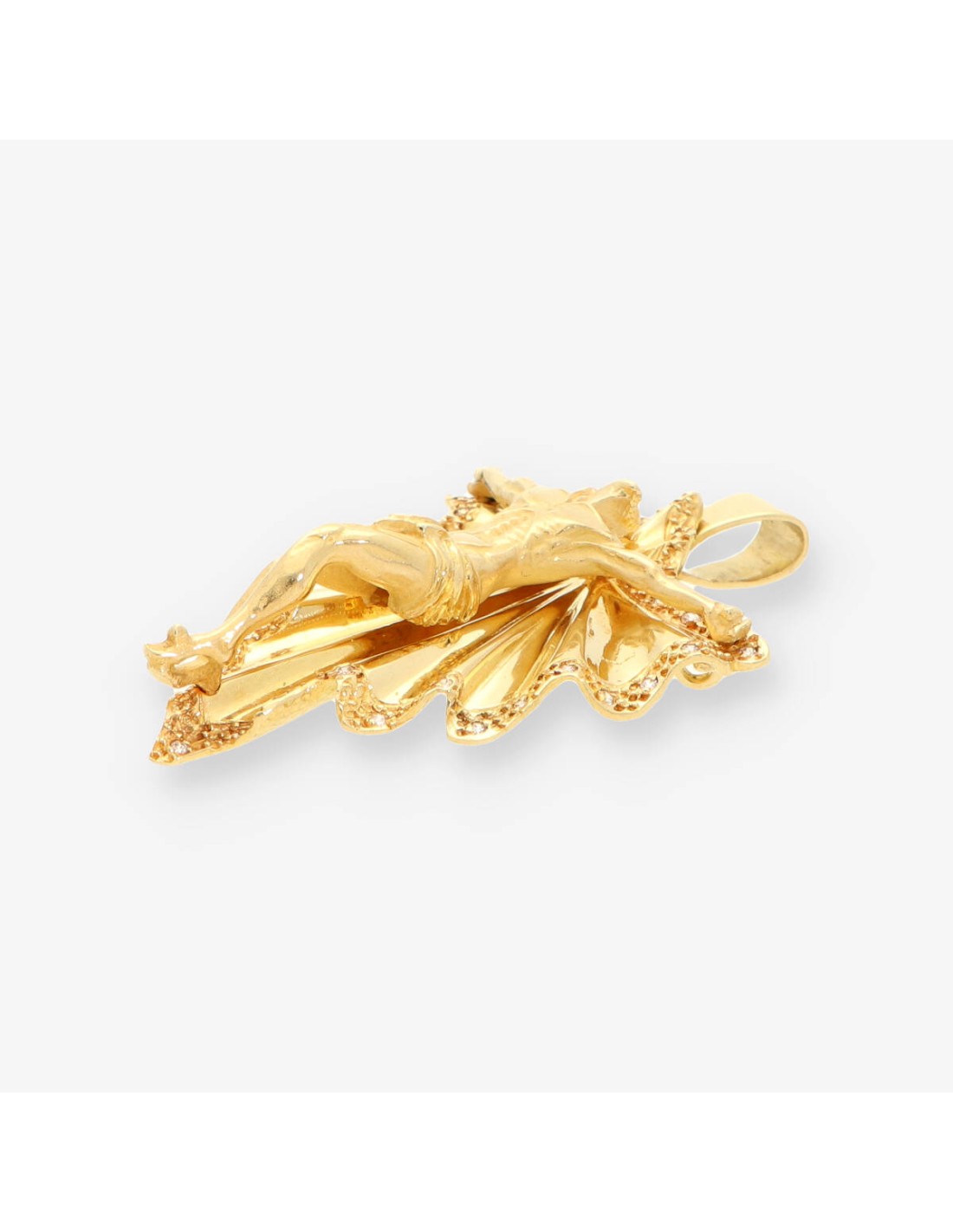 Magnifico colgante de segunda mano en oro amarillo de primera ley en con el cuerpo del cristo llevando la cruz. Una pieza única e ideal para los amantes de las joyas. Largo: 5.4cm. Ancho: 3.5cm. Peso: 20.2gr.