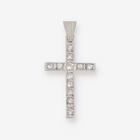 Preciosa cruz de segunda mano en oro blanco de primera ley con brillantes. Una pieza ideal para cualquier momento. Alto: 3.8cm. Ancho: 1.9cm. Peso: 5gr.